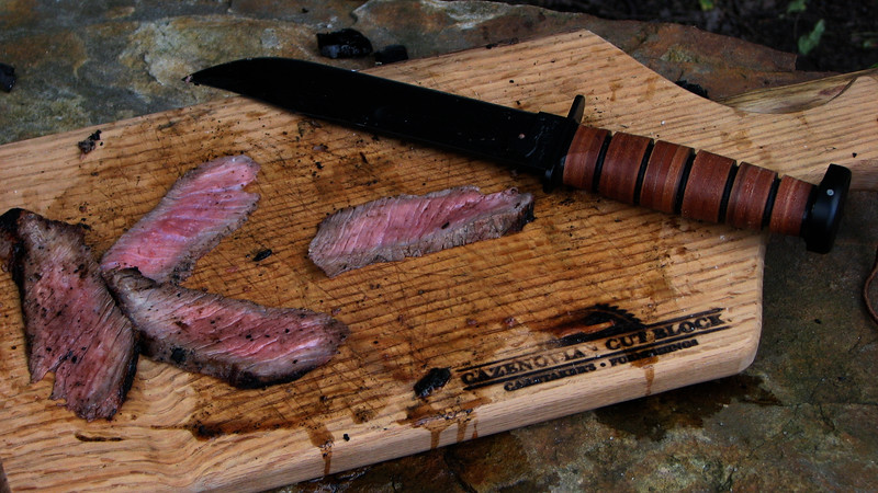 Next a little chopping. Here is one place where I see many newer survival knives suffer. Those with the handles angled down, and the overly thick ones, make slicing and chopping food way more difficult than it has to be.