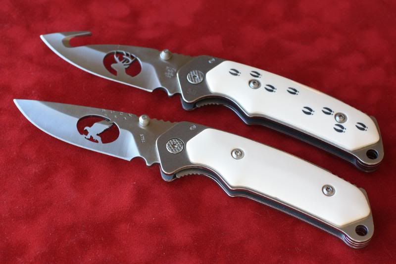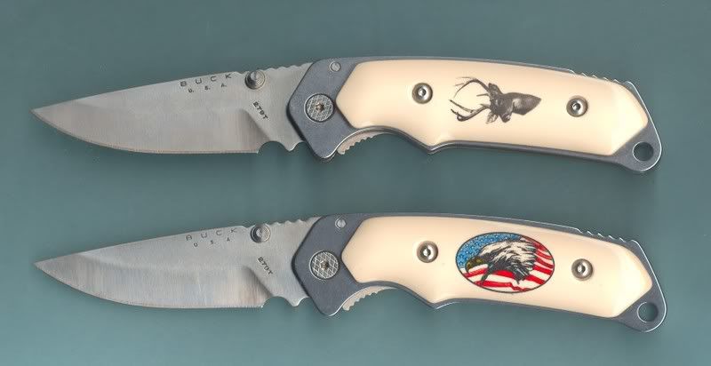 Thread title says it all, for the most part. One of the scales is etched to look like a pile of antlers. The blade doesn't have a model number on it, but it does have the Buck USA logo with the Idaho stamp. Model number is likely 276 or 278 because the blade has a gut hook. The most interesting thing about it is the two deer track cutouts in the blade. It is numbered - only 500 made.