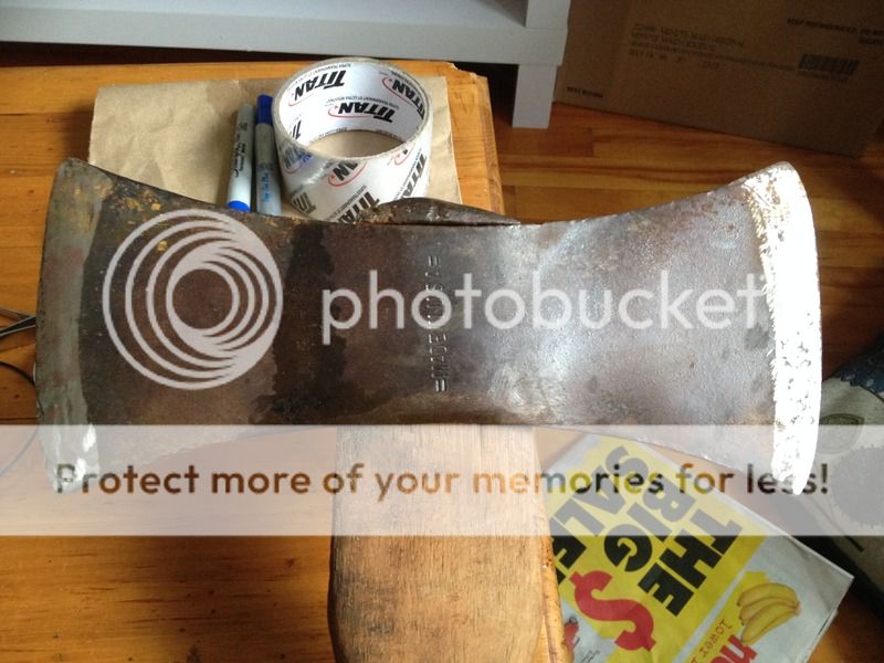 It's shaped like the G Bruks throwing axe, flared up on top and bottom, and looks like a blind man got loose with an angle grinder on it, but nothing I can't fix. Any ideas on the maker? I will try to post pics later, watching the baby right now.