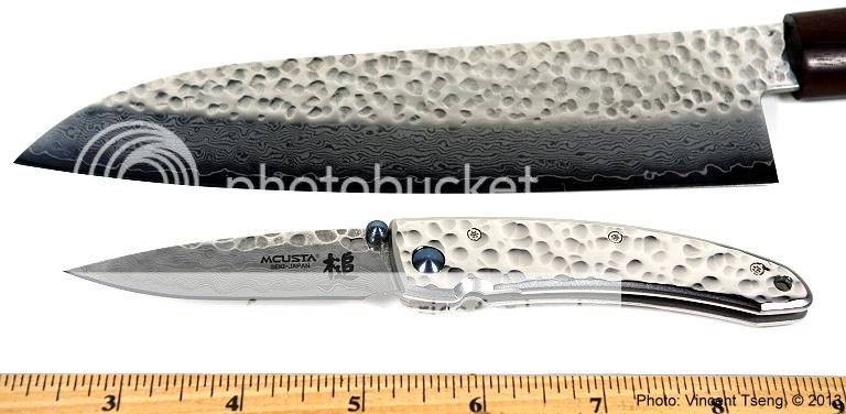 Mcusta 113D with the blade of a SETO I-5 santoku with tsuchime pattern.