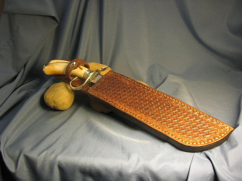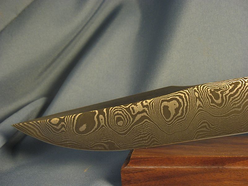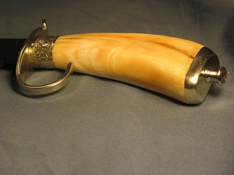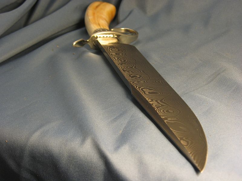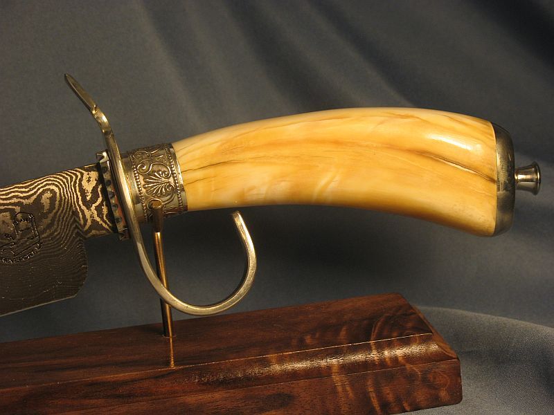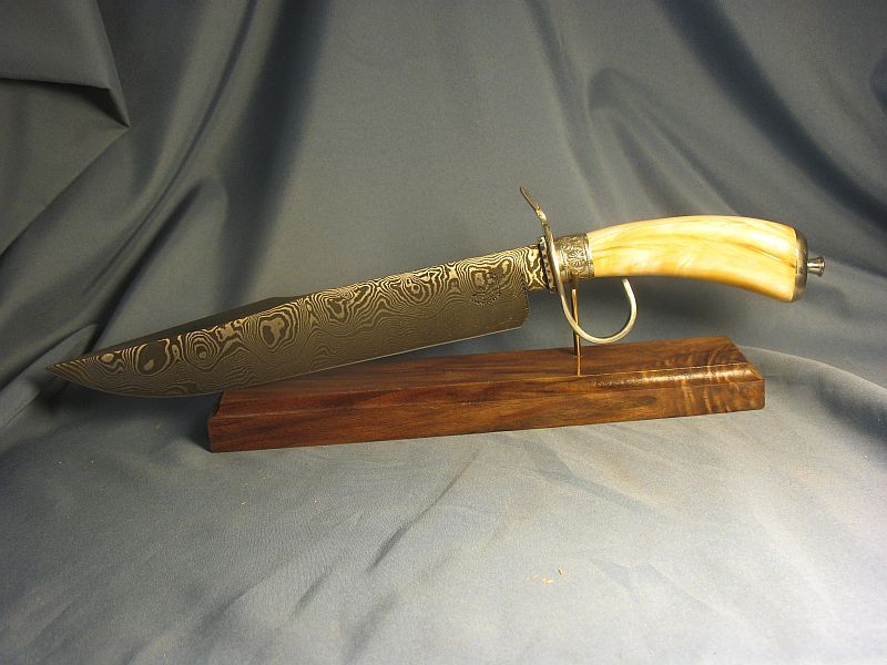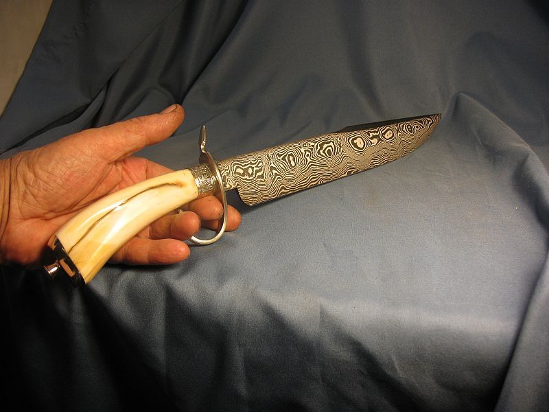 Here is one I just completed. It Has a warthog tusk with decorated sterling silver ferrule. Guard and butt plate are nickel silver and carved skull crusher. My Damascus made of 1084 and 15n20 with a blade that measures 10 1/8 inches and overall is 15 1/4 inches from tip to end (not along the curve). Is 1/4" thick at guard and stays that thick until clip then tapers to tip. A wicked piece. Black walnut stand and thick leather sheath included. It is "SOLD" and 10.00 priority mail. My paypal and e-mail is dangraves4923@earthlink.net Thanks.