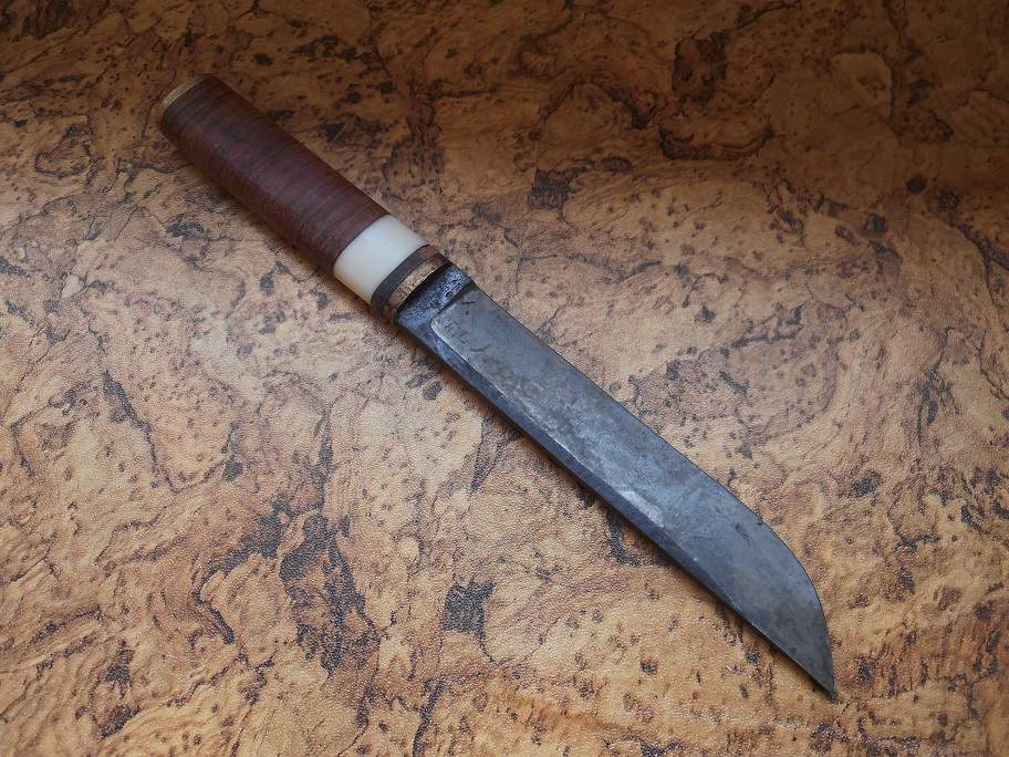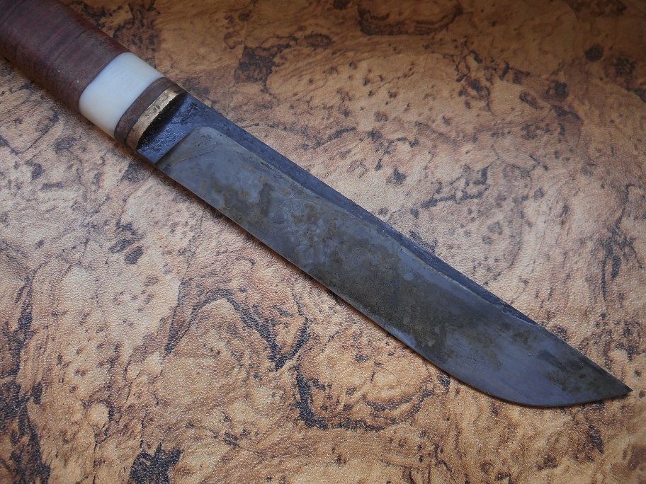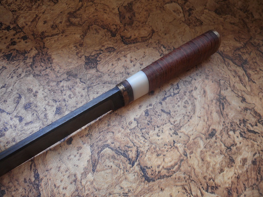 made out of 1084 steel, brass, leather