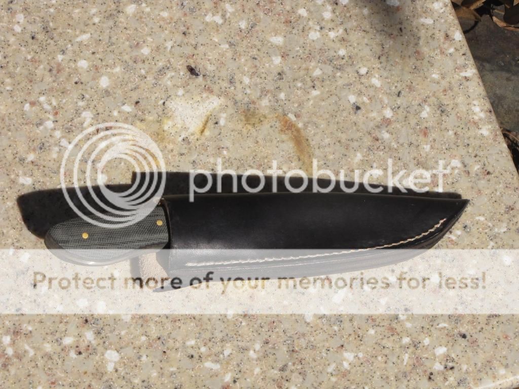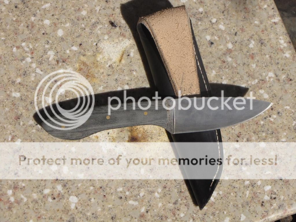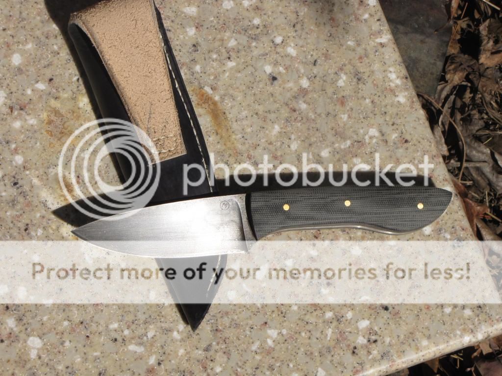 This one is made from 1/8" 1095. Blade is 3 3/4". Handle is 4 3/8" with black canvas Micarta and 3 brass pins. It is flat ground with a convex edge, super sharp and ready to be put to work. Comes with sheath.