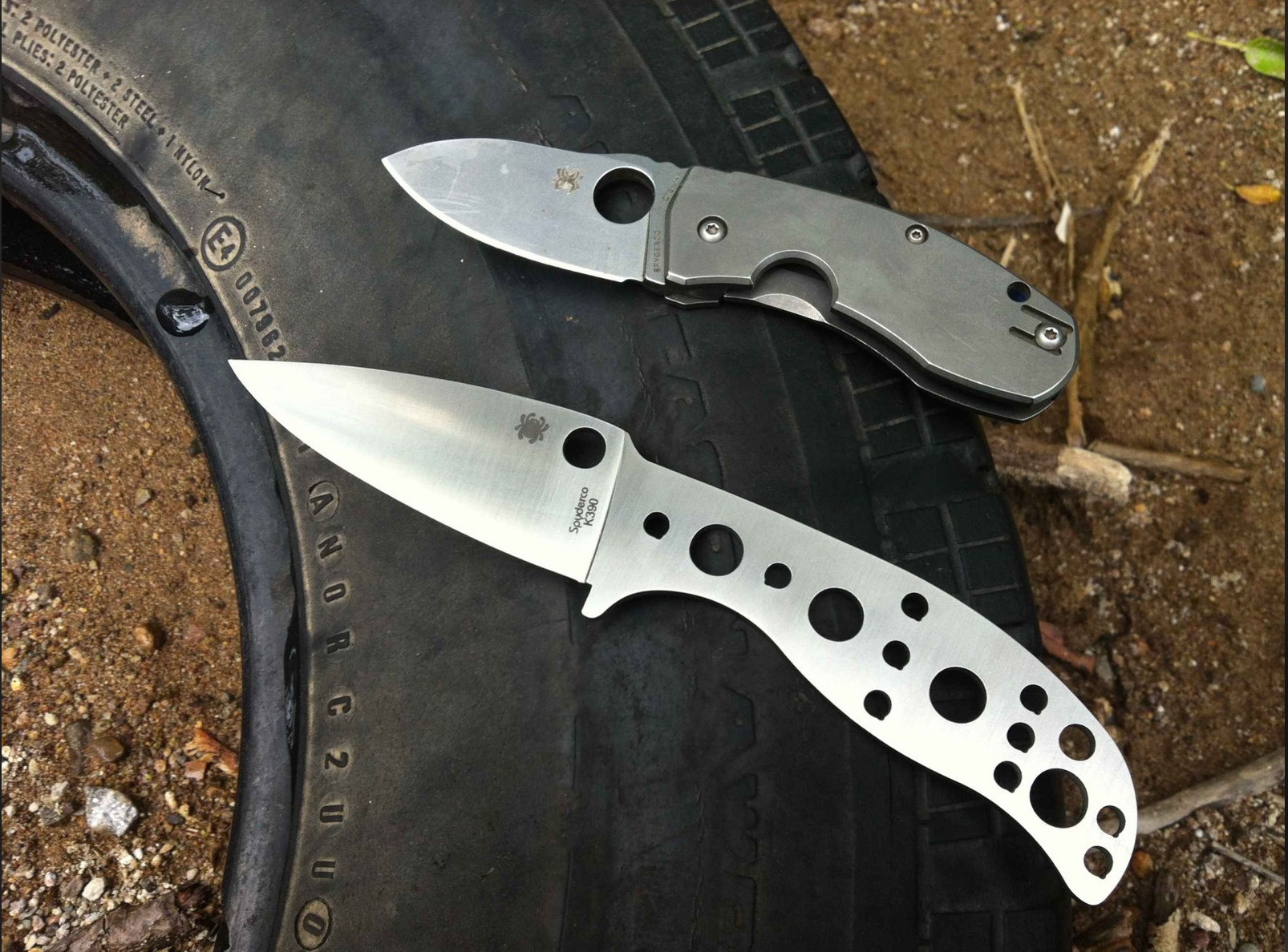 - I couldn't help myself and proceeded to slice the tire up with both pictured knives. The K390 performed admirably, even with the weird angles and forces it was subjected to while I worked my way around the tire. I eventually ran it into the steel belting and rolled the edge - the afformentioned wet dry sand paper and mouse pads were enough to bring the edge back to super sharp.