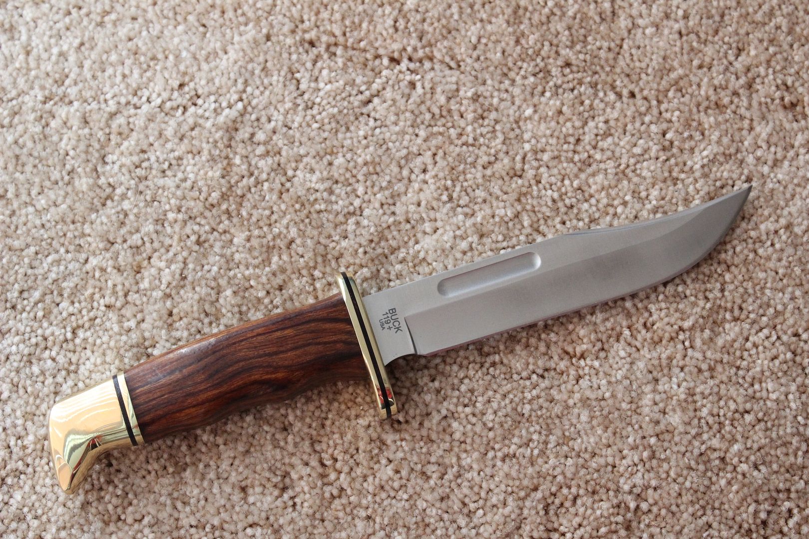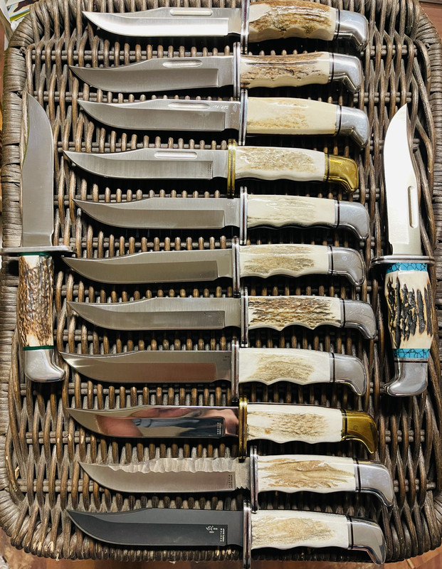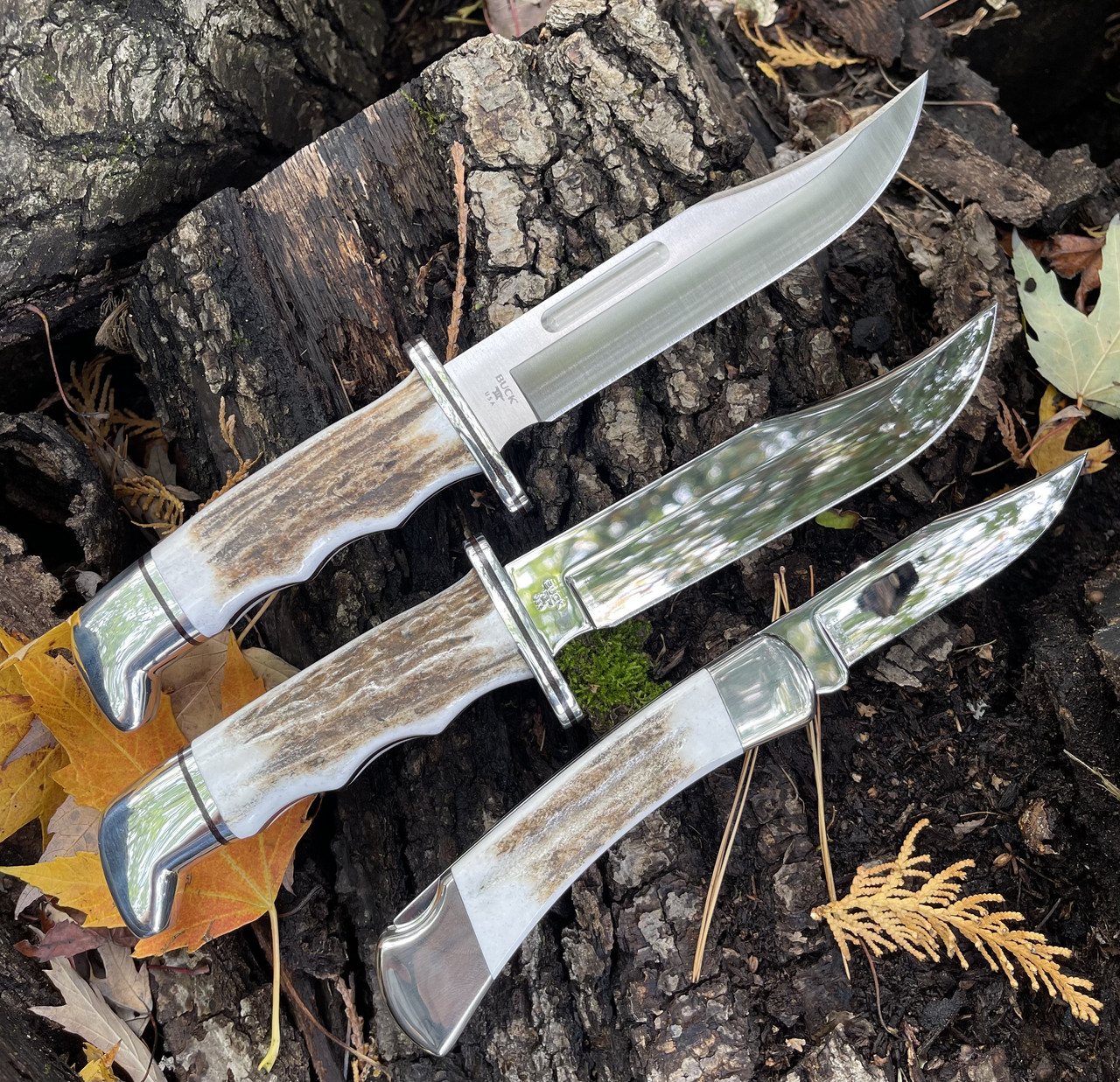 model 104 Standard Hunting Knife c.1947-1948. $8 in the 1948 catalog it sports a 5-1/2" by 1" blade. In the 1951 catalog it was called the Camper and inflation had pushed the price to $15 and a $16 Lignum Vitae handle option was offered. This knife is considered the precursor to the modern day 119. The 1st knife in the 2017 75th Anniversary Historical Set is a copy of this knife.