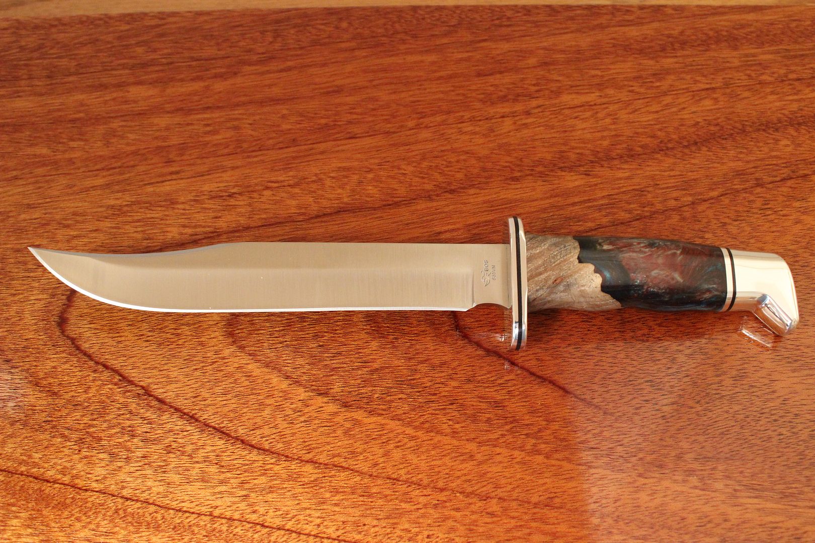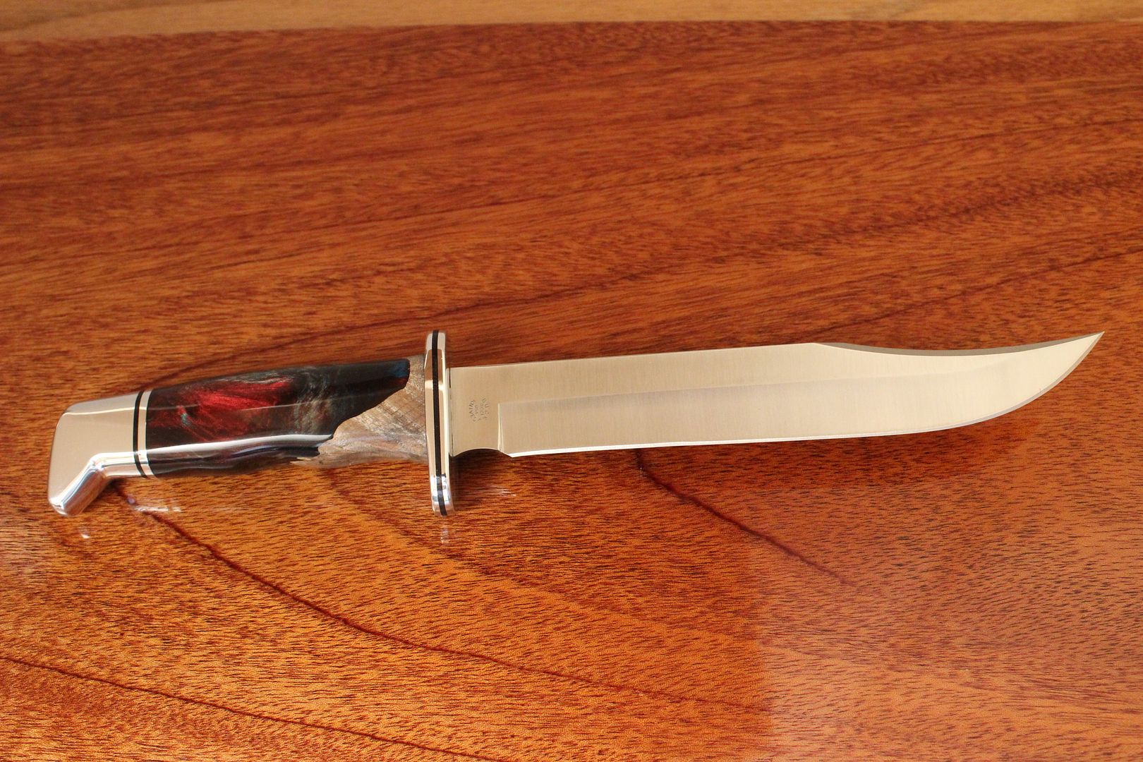 Good eye. Every other Melamine knife I've seen pictures of were leather spacered barrel nuts. I corresponded with Larry Oden a long while ago and he suggested it was a factory re-handle or repair (Lifetime Warrranty in action?). The failure of the Melamine handles was that they cracked if dropped when cold. I belong to a local club, St Louis Antique Arms Collectors, and you would hear on occasion.... "if they could only talk". Just to be contrary, the difference between a barrel nut and a pinned pommel could be one day..... ;o) /RMaybe I'm seeing things...is the melamine 120 pinned? I didn't realize any melamine knives were pinned.