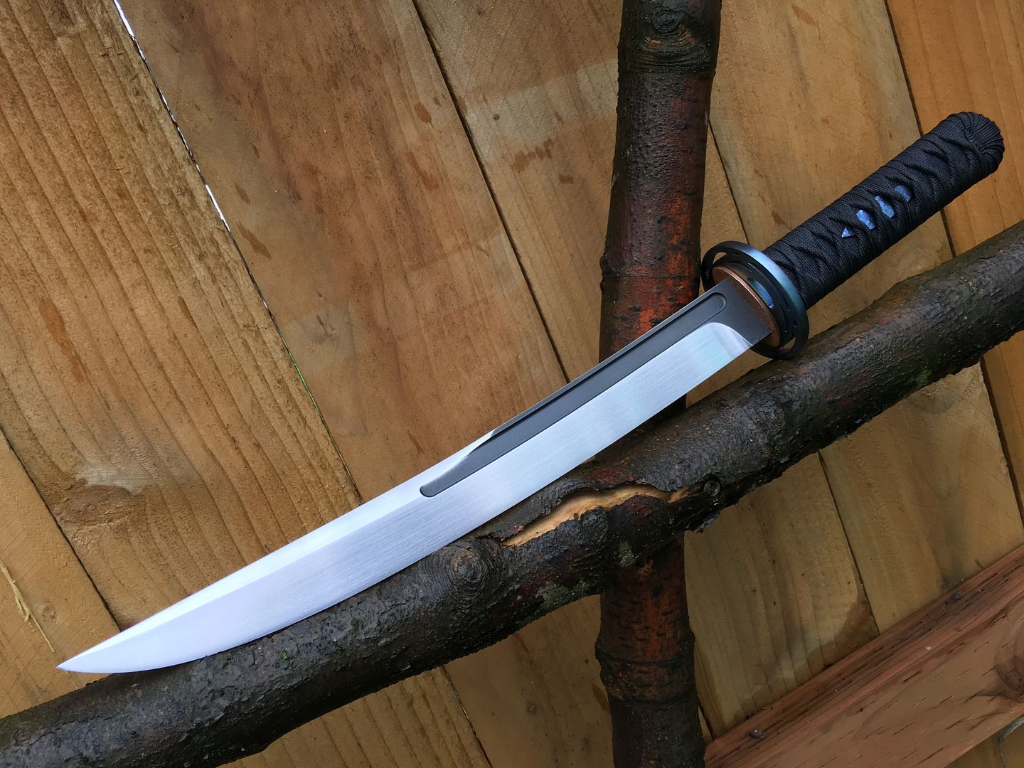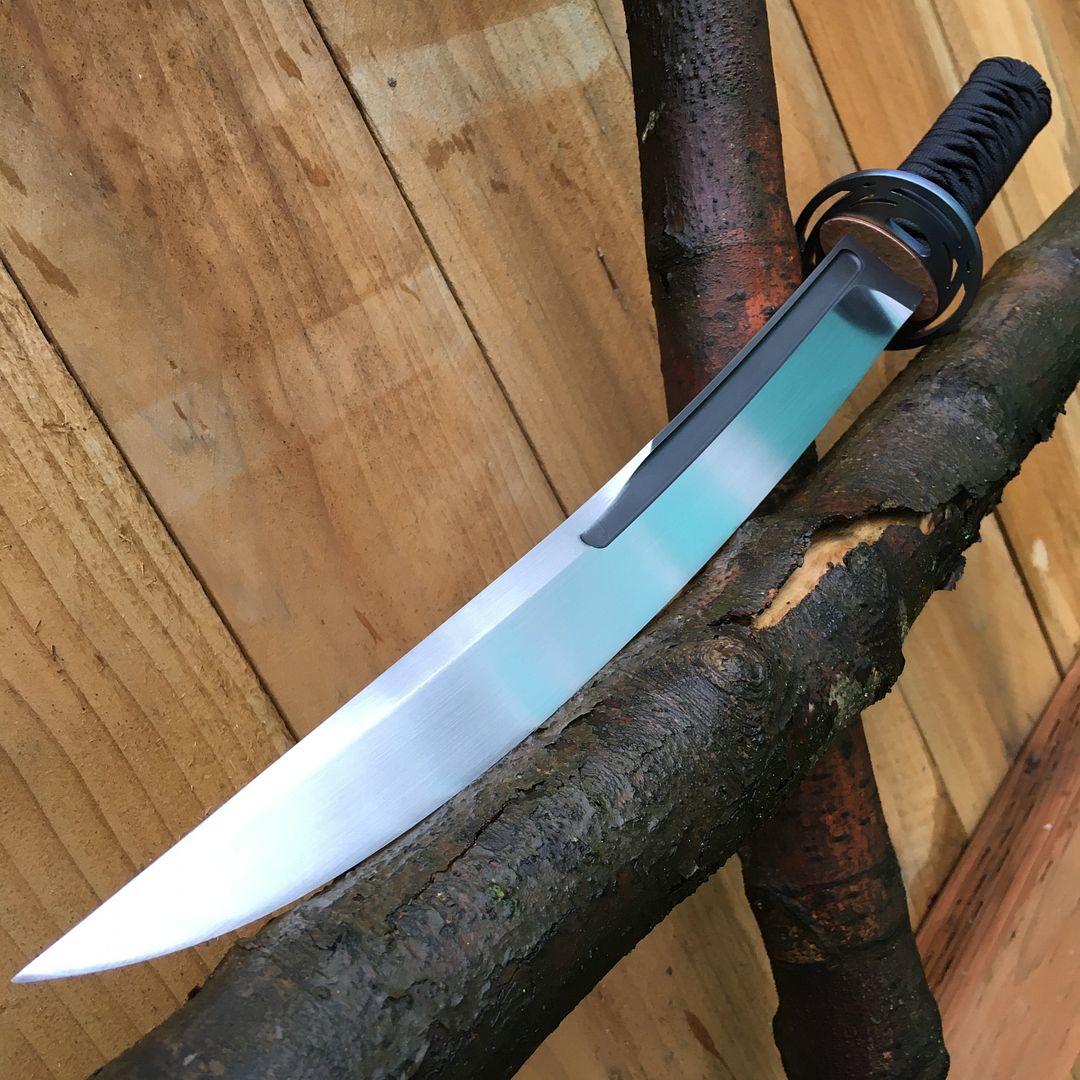 Between the fullers and nice distal taper starting midway down the blade it is extremely well balanced. The Tsuba and munuki are Anodized Titanium and the seppa is textured copper.