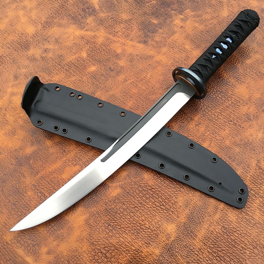 While I enjoy doing the carbon fiber saya for these, not everyone can pony up for the amount of work that they take, and since this one is up for grabs I made it a very nice leather texture kydex sheath. The sword snaps in securely and could be carried inverted if desired.