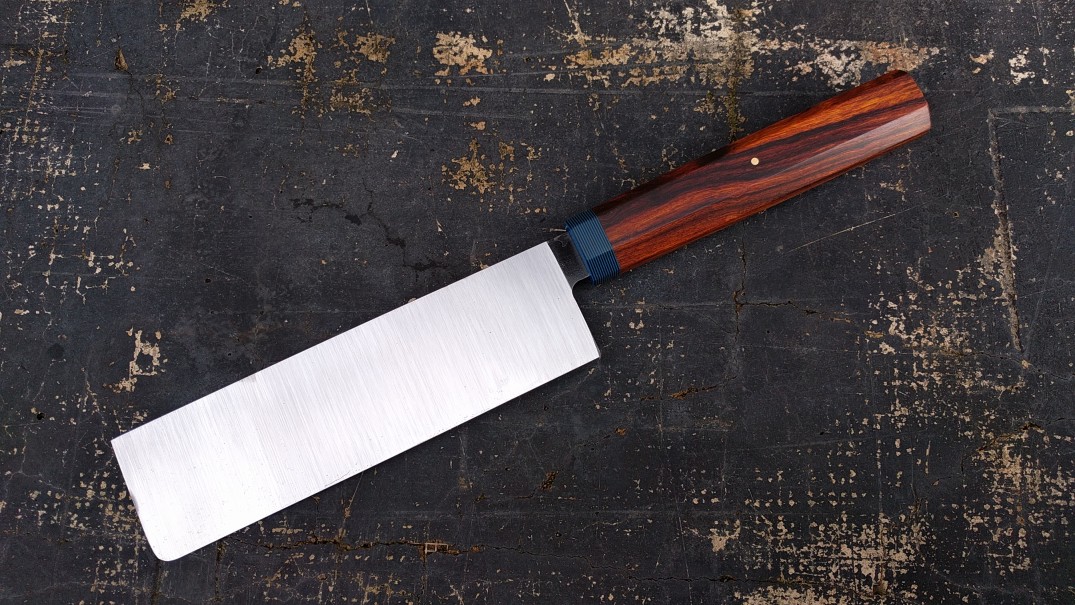 This is my first usuba, 160mm of very hard 3.175mm thick 1084 from "tip" to bolster, hand-finished bevels with a belt-finished urasaki back. Haft is desert ironwood with a 2x2 blue/black G10 bolster. A cavity in the handle is filled with epoxy colored with lapis powder that was hand-ground by my recently departed friend & long-time partner as part of another project (HeftyLefty here on the forum).