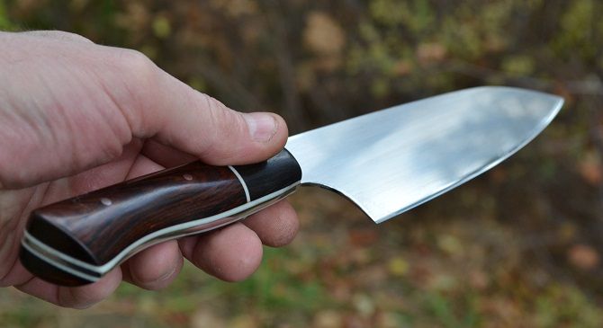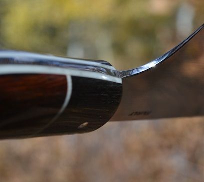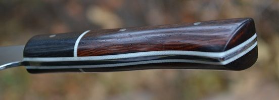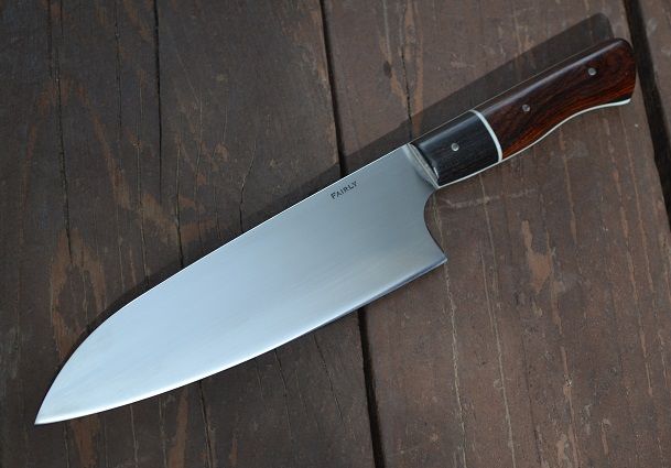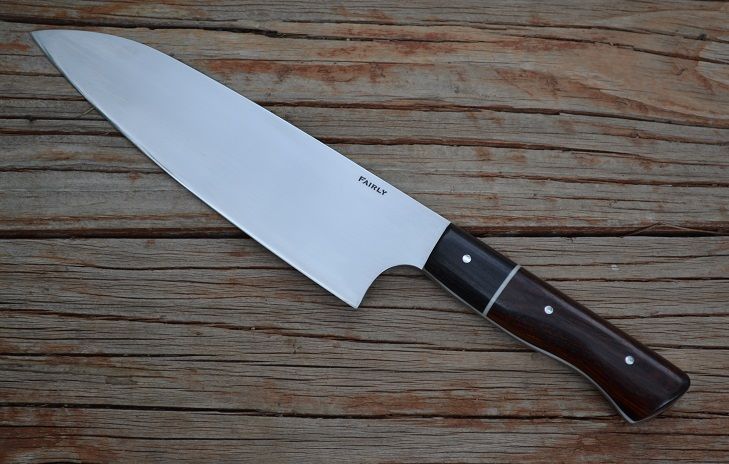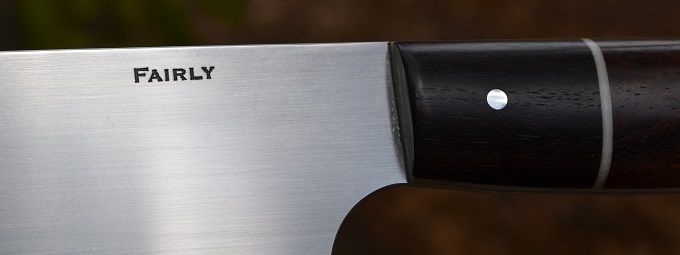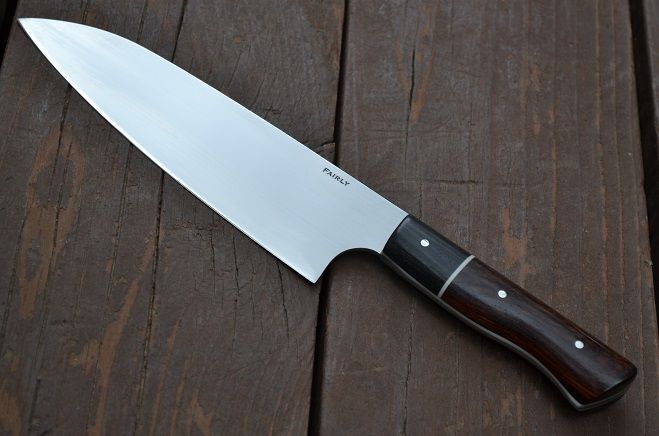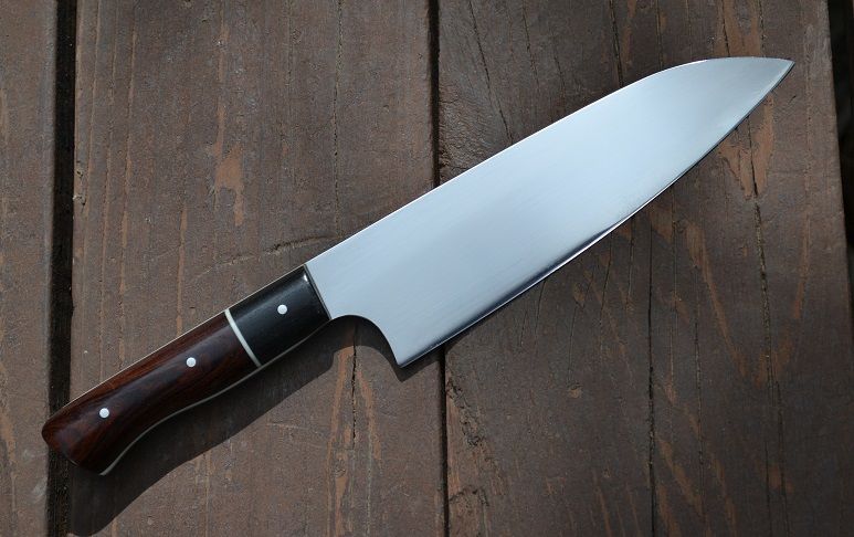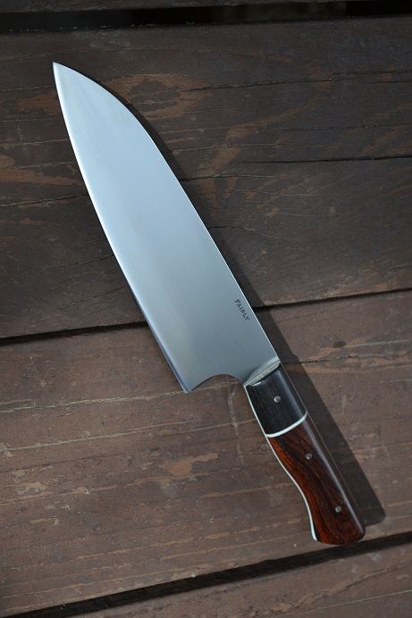This one is a great overall kitchen knife in 52100 high carbon steel. The steel went through my extensive heat treat process and is around 62 RC hardness for great edge holding. It is easy to sharpen with great geometry and feels great in the hand!