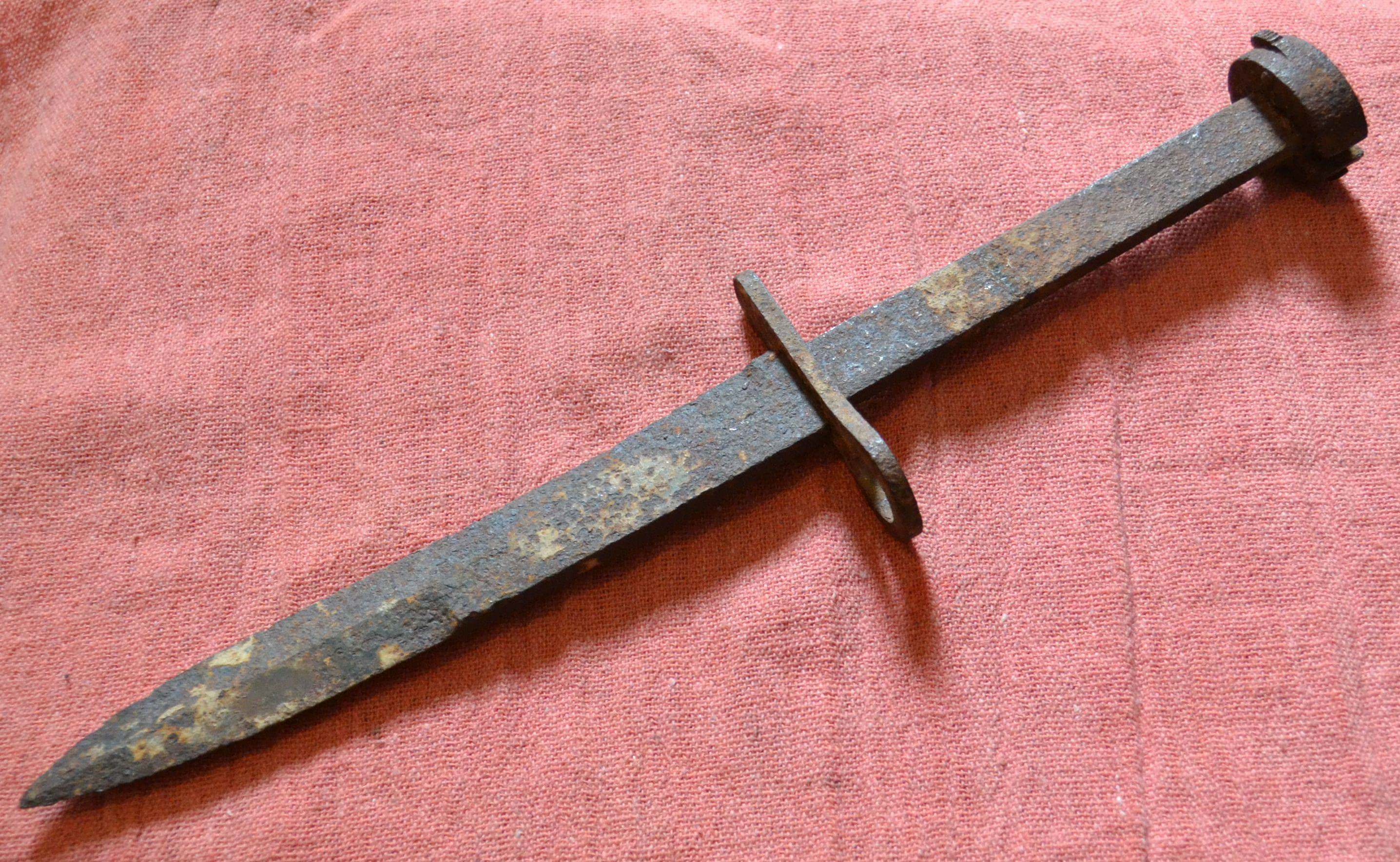 this is a blade heading my way to have some refurbish work done and I was wondering if anyone could identify it? She’s rough but still pretty neat. I’m thinking it’s a M-4 bayonet from 1944 ish!?