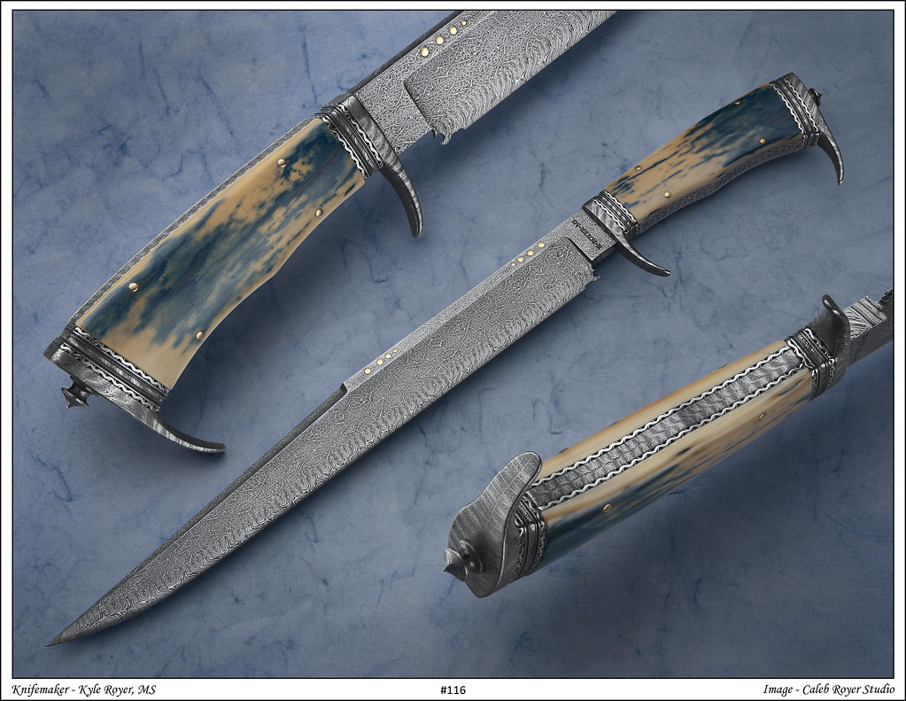 The blade is 13" and it is forged from 1080 and 15N20 in a Mosaic Damascus Pattern on the top two thirds of the blade, running along the edge of the blade is a bar of Twist Mosaic Damascus. The handle is blue/cream colored Fossil Mammoth Ivory from Alaska. The fittings are of the same damascus pattern as the blade, Twist Mosaic, only in a tighter pattern. The file worked liners are of German Silver and they are a full Vine pattern. The blade has been ground on an eight inch wheel to give it a hollow grind. The clip has been ground deeper than the blade on a three inch wheel so it can be sharpened if wanted. This is the second blade I’ve ever hollow ground. The blade has eight solid 14 karat gold pins and the handle has four solid 14 karat gold pins. All the pins have been domed to give them really good holding abilities and to add texture to the knife. This knife is a take-down for maintenance purposes. I also made the sheath and it has a gator skin overlay. The blade in this puppy is a full 3/8 inch think, BTW!