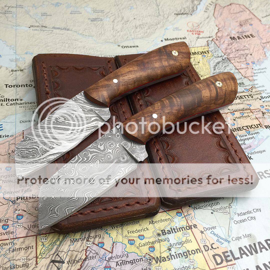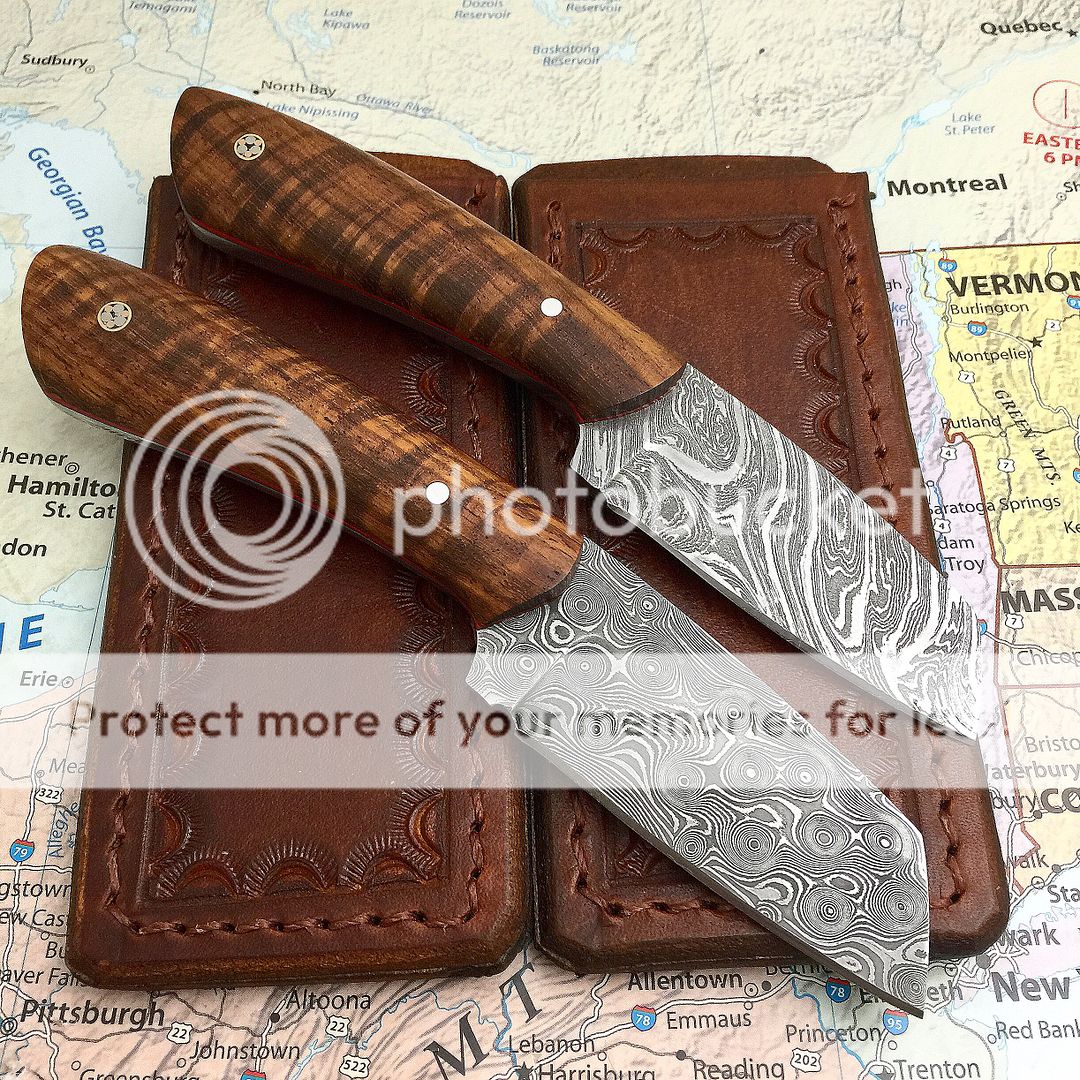 ‼️‼️ Forsale ‼️. 2 back pocket models. Top is random pattern Damascus. Bottom is raindrop pattern Damascus Both with red liners silver pins with mosaic beauty pins in the rear Beautiful African afroromosia. Both come with tooled leather pocket sheaths Top measures 6 5 /16"oal. 2 1/2" blade Bottom measures 6 1/2" oal 2 5/8" blade. Top is $255. Bottom is $265 shipped in the USA First I'll take it post gets it