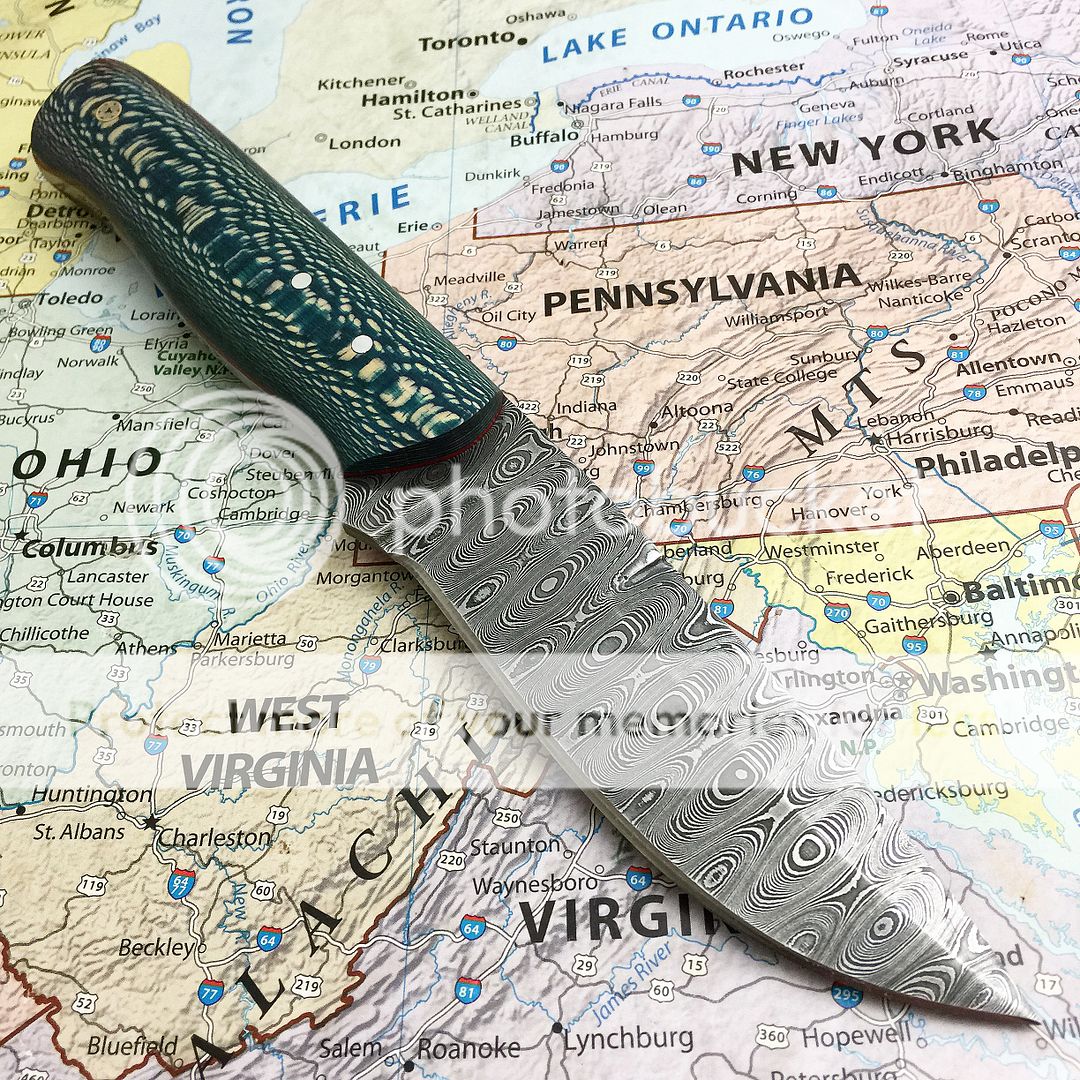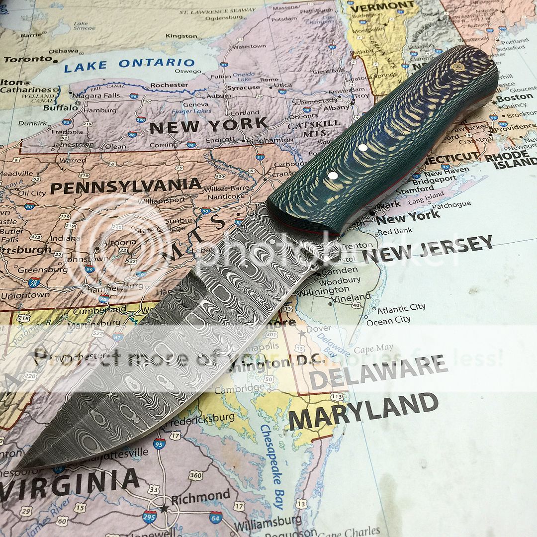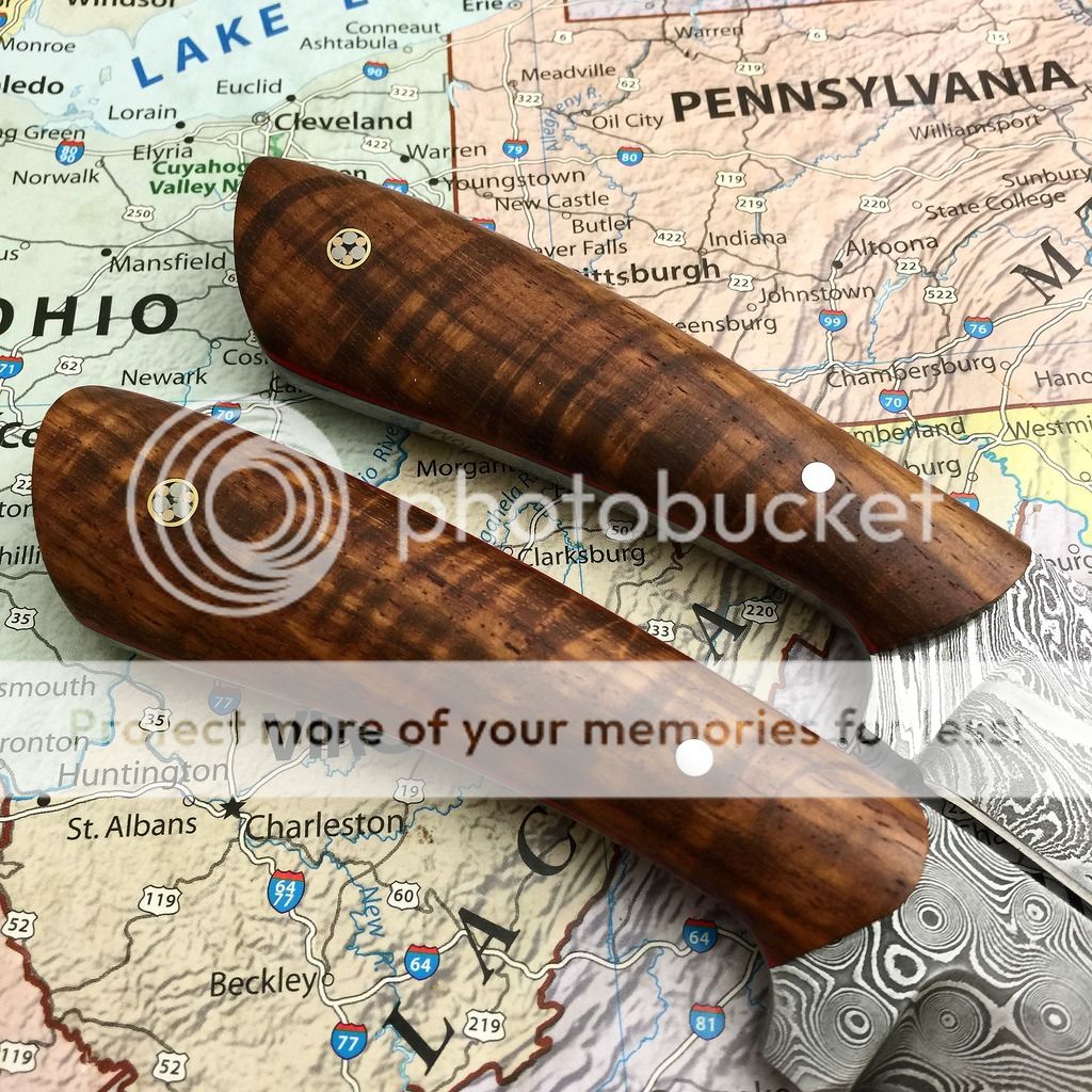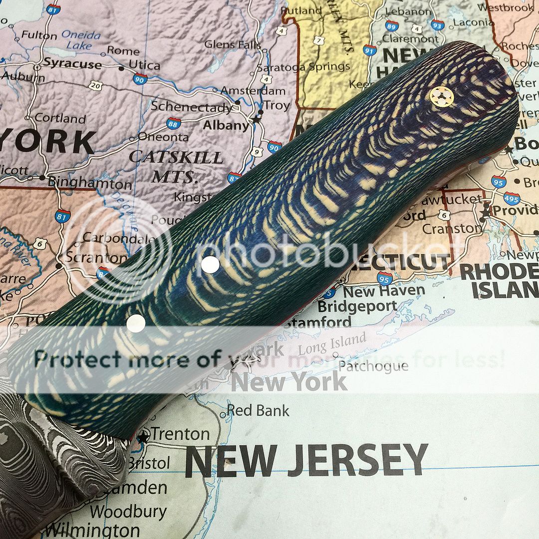 This is a stunner field knife in dyed sycamore. Red liners. Silver pins mosaic beauty pin. Ladder Damascus with a long drawn top bevel comes with tooled leather sheath 8 5/8" oal 4 3/8" blade. $ 375 shipped in the USA