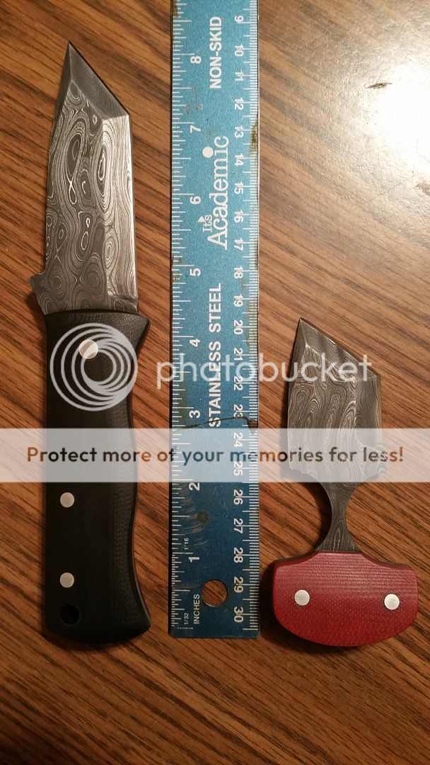 Punch dagger/tanto and CQC7B tribute, both from the same billet of Brad Vice damascus. Prices include fees, shipping, and kydex. Punch dagger $150, Emerson homage $350.