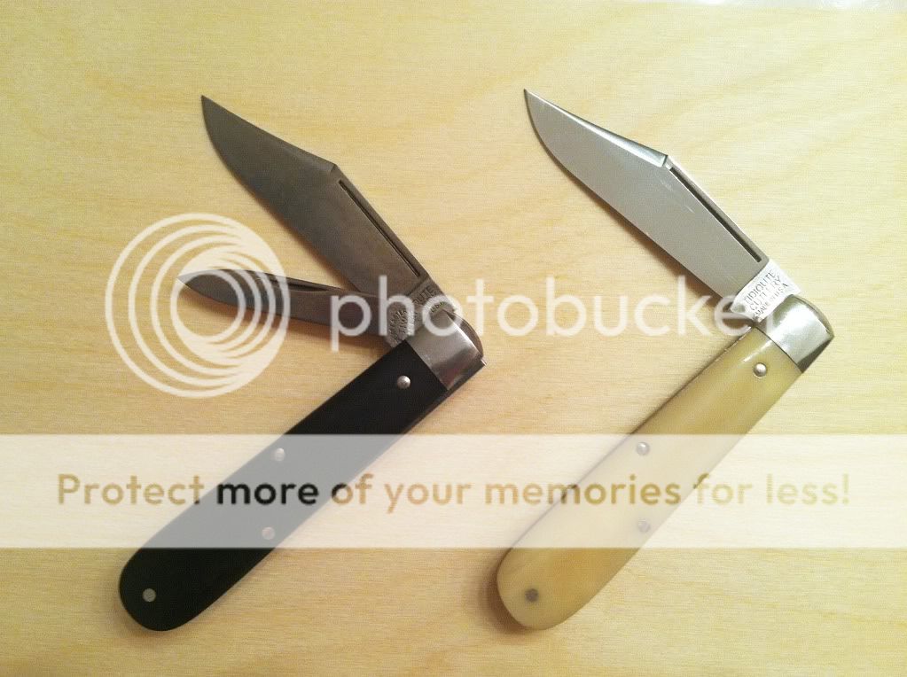 I have two GEC #15 Boy's Knives for sale. The first is a clip point two-blade in Ebony. Both blades have a forced patina, but otherwise is in great condition. The second is a clip point single-blade in Smooth Bone. This one only has some slight darkening to the spine and spring, but otherwise is in excellent condition. Both knives come with the GEC tubes and wax paper.