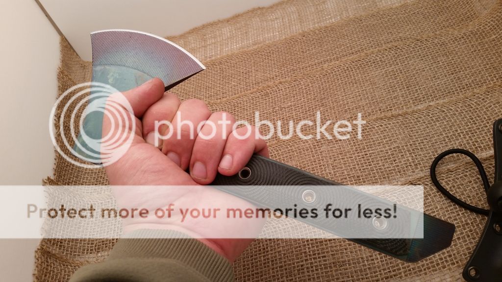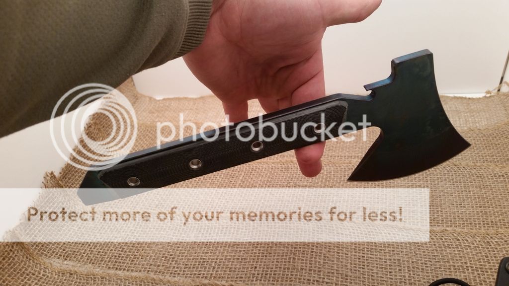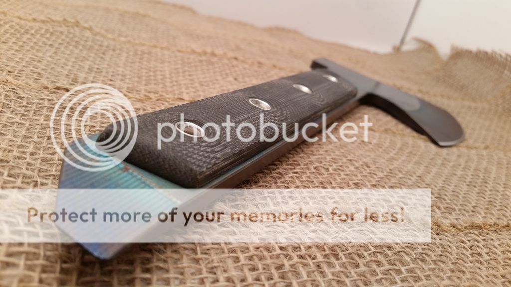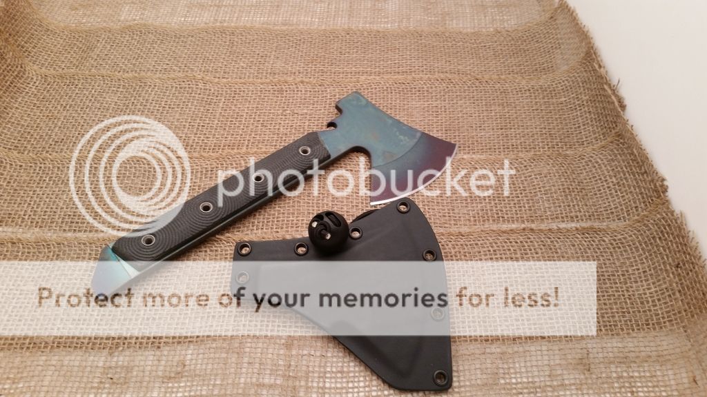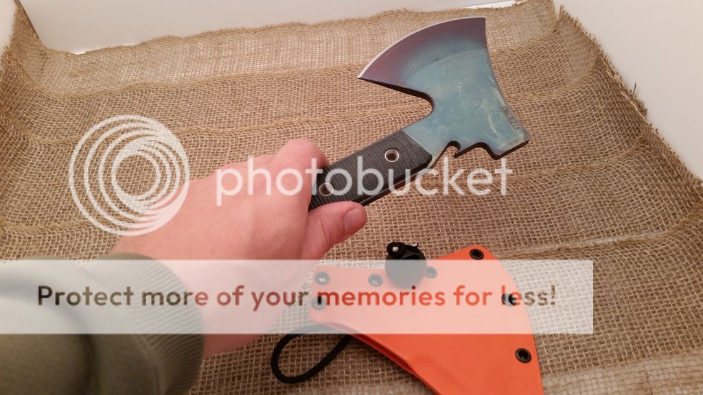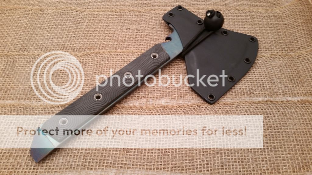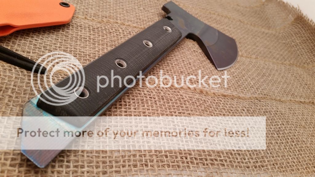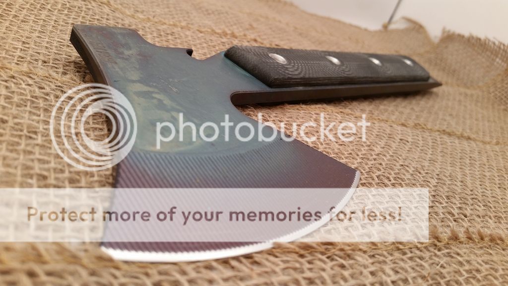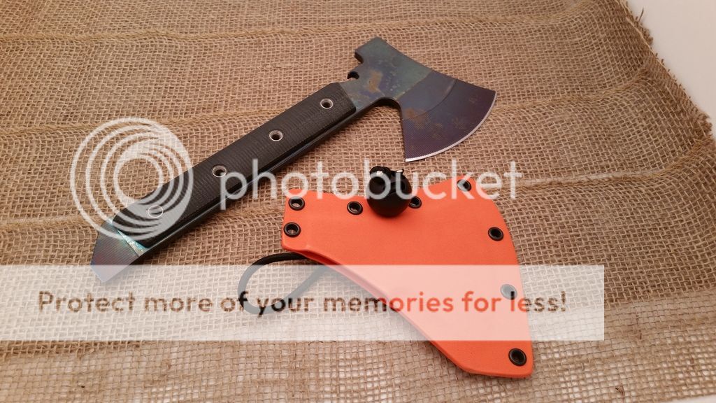 This is my first run of the Gravelle Minihawk, make from A2 tool steel and featuring Micarta handles. Under the scales the handle is skeletonized to reduce weight, as you can see in the last picture the balance is very far forward or chopping performance. the sheaths have adequate retention however I added a bungee ball for added security, a teklok can also be added for belt carry. Each hawk also has a bottle opener. I have black or orange sheaths available.