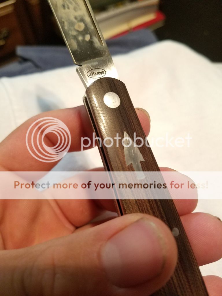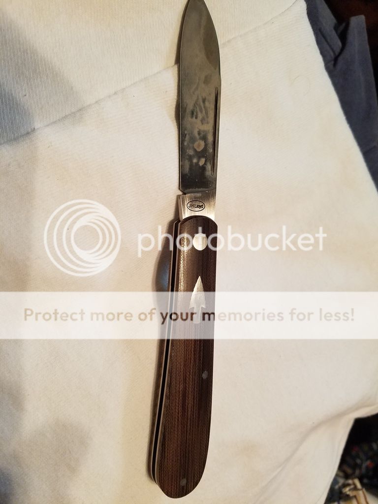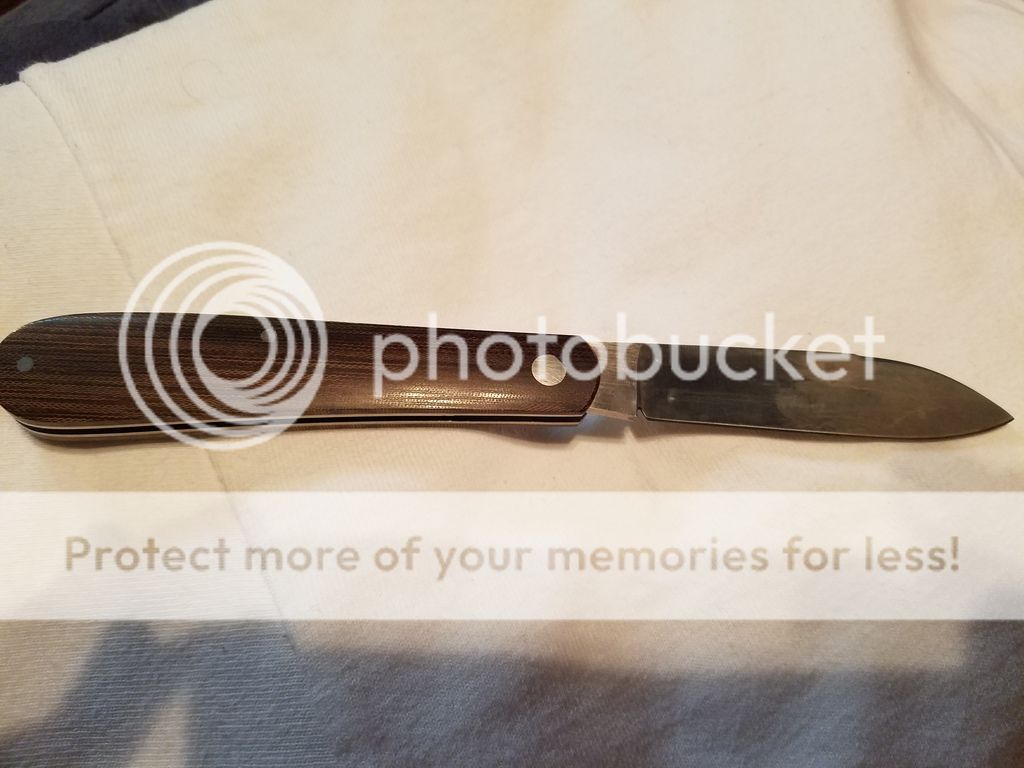 First up is a John Lloyd with brown micarta scales and 52100 blade steel. It has a patina on the blade and back spring. It also a slight side to side blade play. There is also a couple of scratches on the shield. The back side pivot also has a small nick in iy, this is how it was purchased. Price is $200.