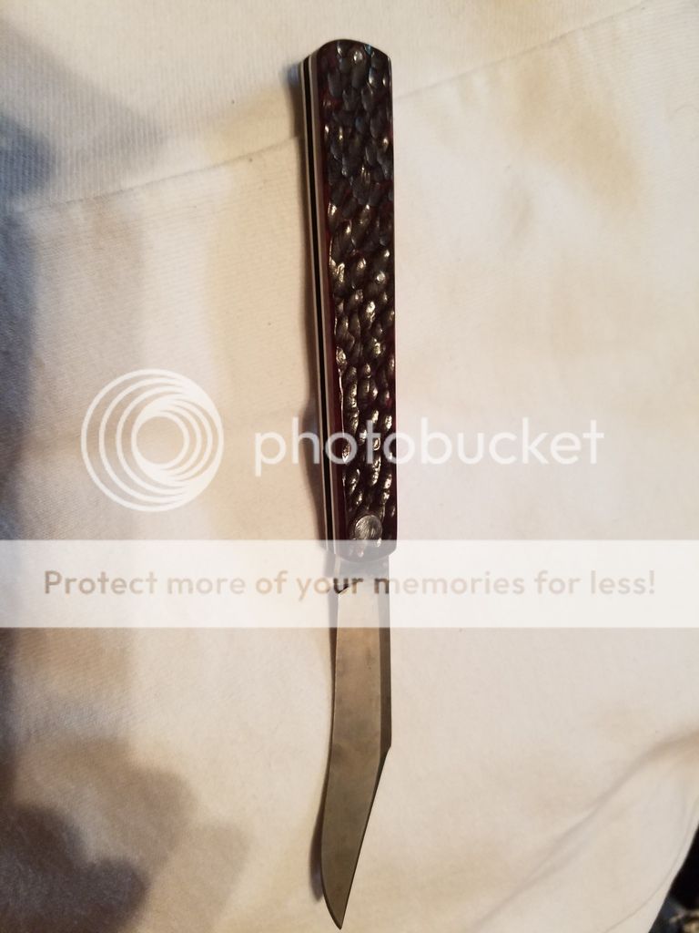 Next up is another John Lloyd in beautiful red jigged bone. The steel on this is also 52100. This has a patina on the blade and some very faint peppering spots on the backspring. This also has side to side play. Price is $200.