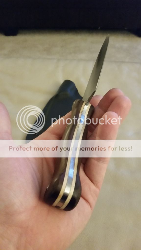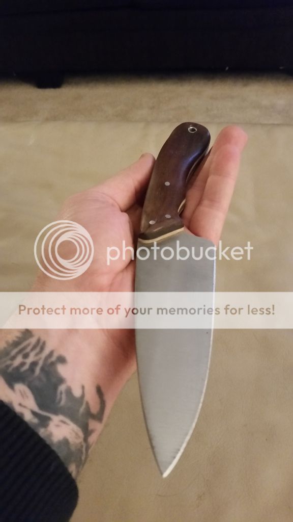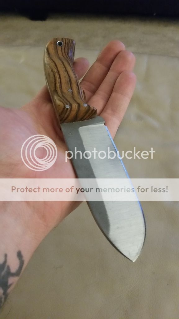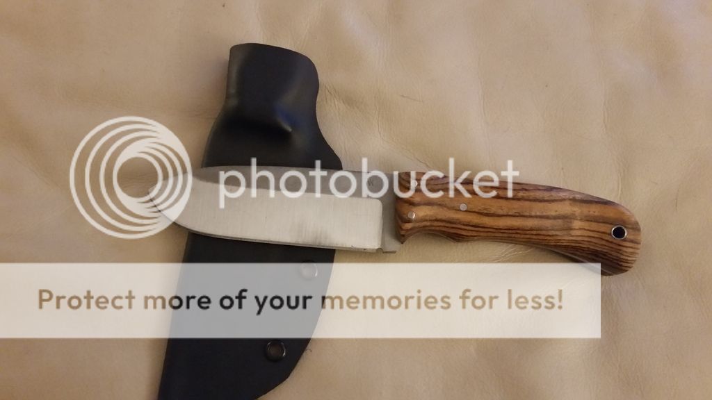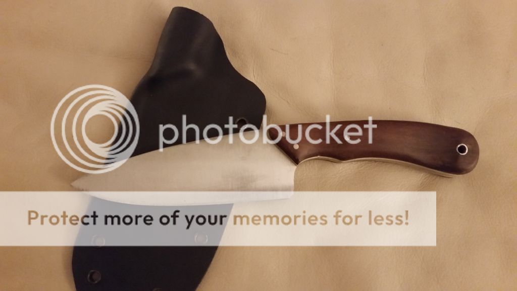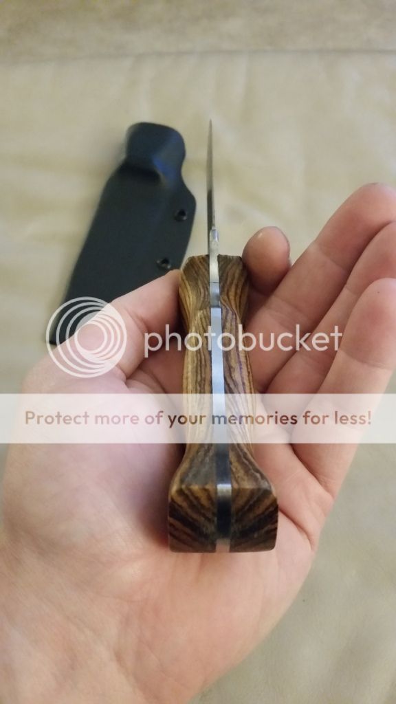 NK Utilibush knife. O1 tool steel 5 1/4 blade, 9 3/4 oal. 1 3/4" at its widest point on the blade. 62-64rc. Katalox wood scales and maple liners with stainless pins and tube. Kydex sheath included. Will make leather for it for an additional charge.