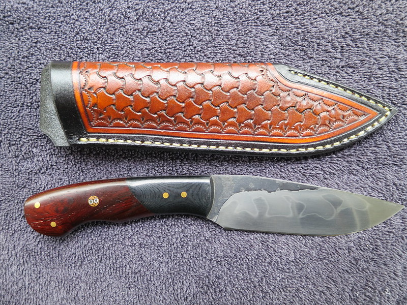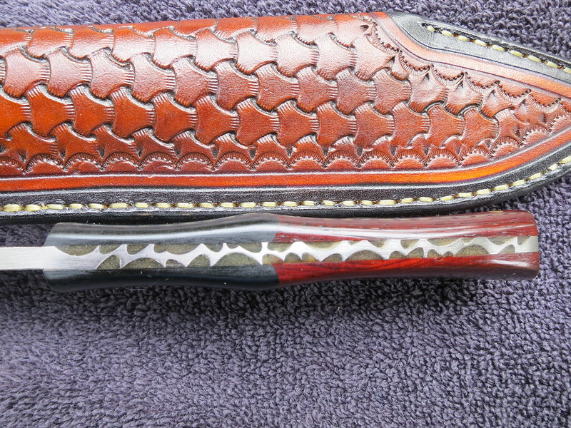 - Cocobolo & Black Linen Micarta handle, attractive brass and mosaic pins, made on/around Oct 2011.