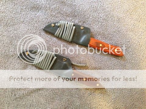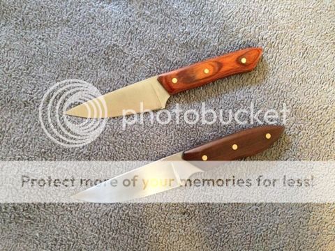 Here are two small utility / hunting knives. Both of these sat at a gun shop for a month where they weren't handled very well. The larger one I had to re-finish the blade, and there are a few blemishes on the exposed handle steel on both. I'm selling these as is, but they will make wonderful inexpensive workhorse knives. Both come with kydex sheaths as shown in the picture. Both are ground super thin and sharpened to 6000 grit on water stones, so they are ready to cut away!