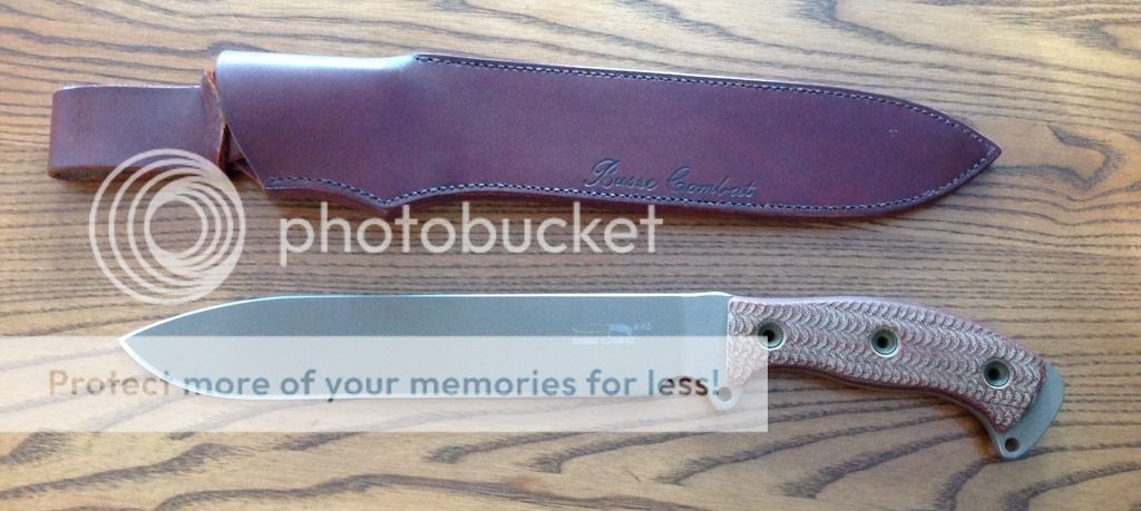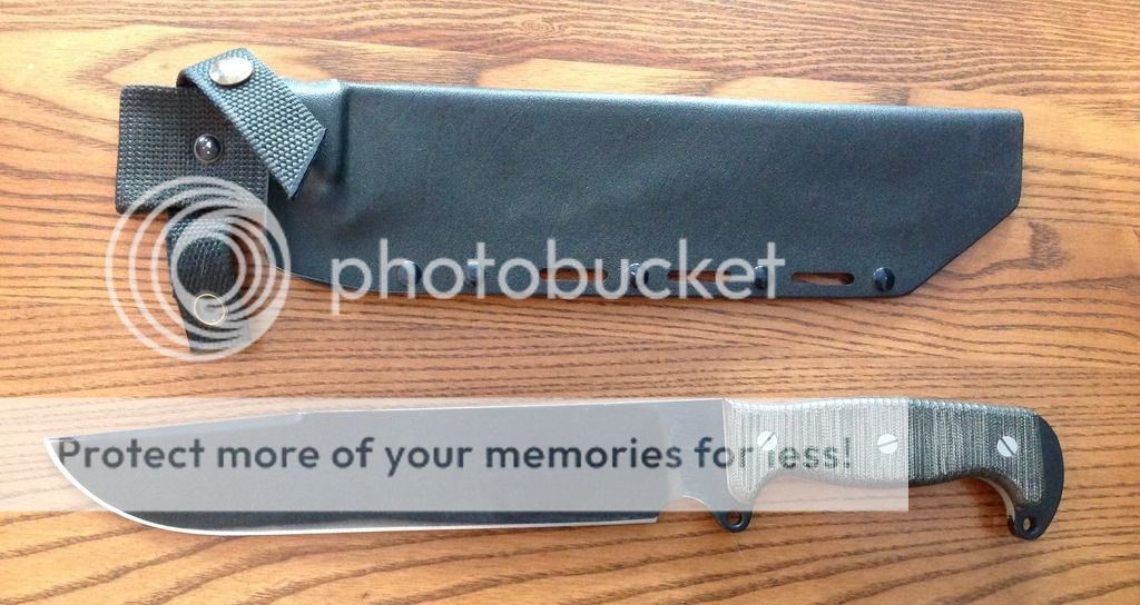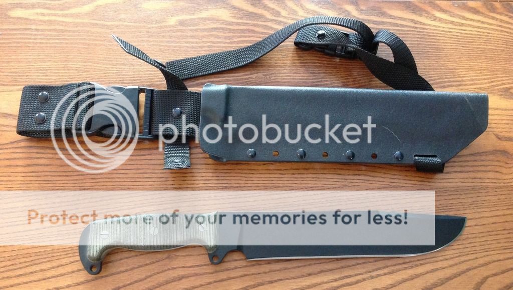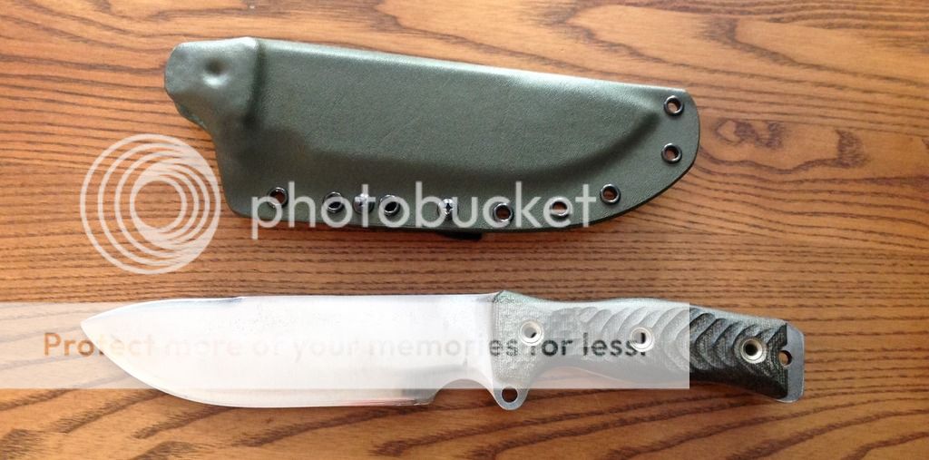 Sarsquatch user with black canvas magnum scales and OD Rainwalker kydex (No tek lok, but will come with a kydex drop loop, I forgot to swap before I took the pics). This was a CG that has been stripped and had the convex grind zeroed out. It's a great slicer, and chops really well with the thinned out grind.