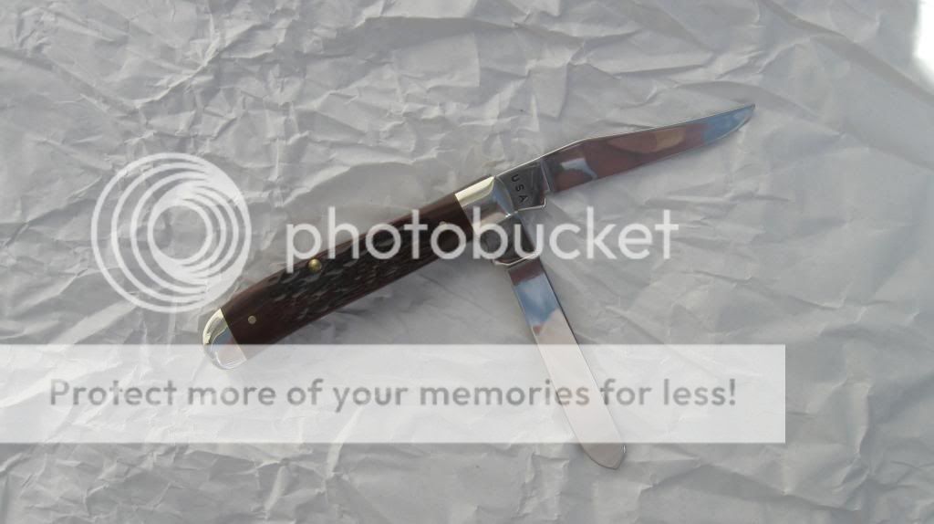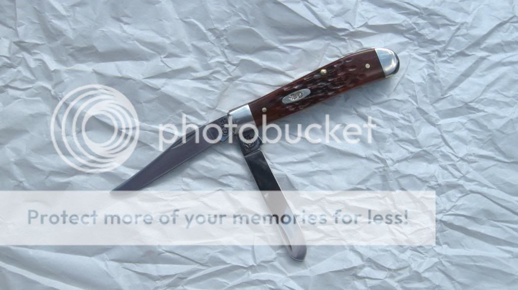 I'm selling this 2000 (10 dot) Case Trapper 3-1/2 closed. Dark Red jigged bone handles, stainless steel blades, wonderful condition! Comes with box! Has been carried a few times but