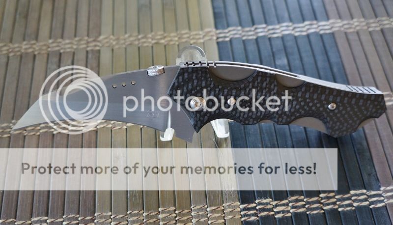 I have a near mint (very minor scuff on spine and clip) collaberation knife by Howard Viele and Liong Mah made in 2004 and is S/N 5. This is a hawkbill with titanium scales and carbon fiber overlays. The blade (ATS 34) is 3 1/8" long and OAL is 7 1/2". It is a liner lock and has a titanium clip and a thumbdisk. It can be flipped but takes a bit of a wrist flick. I need to get $350 SOLD, I prefer PP and will eat the fees. Shipping will be $5 for USPS Priority/Delivery Confirmation/Insurance.