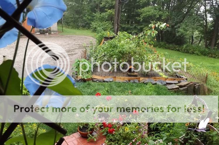 In middle is Sasha, the gentlest, softest little girl who hunts crickets and grasshoppers full time. She hops up on the kindling box to eat the blossoms falling from the pole bean. And, surprisinglythere are no beans on the lower part of the plants. Hmmmm. She did fall back down between the block wall and the kindling box, completely jammed in ... and needed help to get out. I have since blocked the ends where she jumps up.