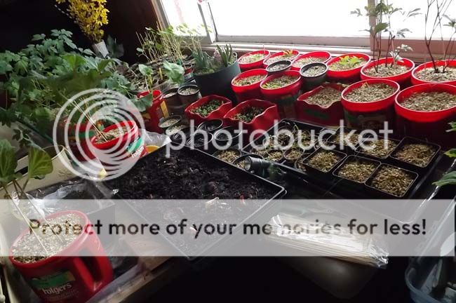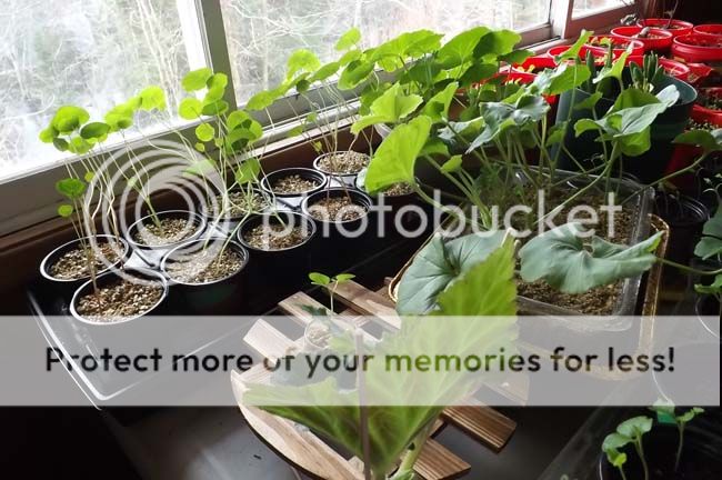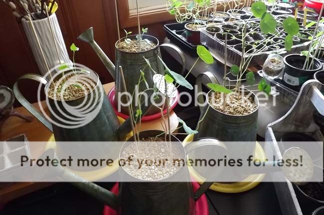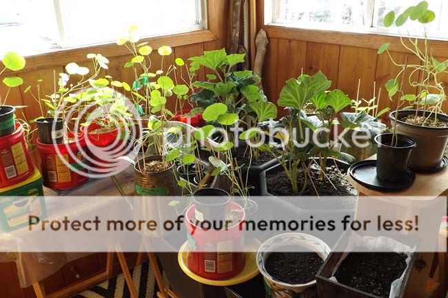 On the 'hospital' end of the grow table, you can see that (nearest the window) the healthy nasturtiums are lanky and have already started to coil their stems in that corkscrew (elbows on the ground) habit they have. Planted March 13th ... a little too soon perhaps. There is a morning glory (in a shot glass) that was too tightly formed after germinating yet is progressing well with care now. My best brag are these geraniums, in the foreground, propagated from stem cuttings. Also trying same with an overly tall begonia ... but not so sure. Time will tell.