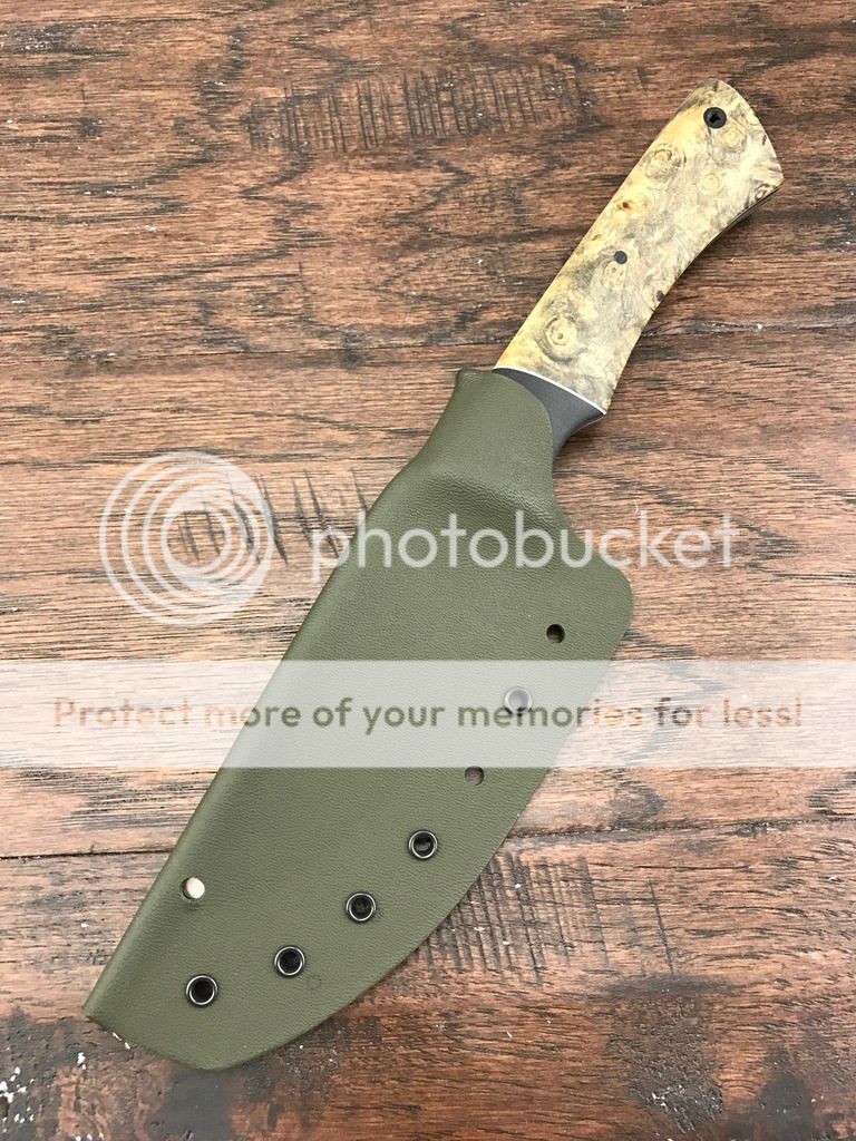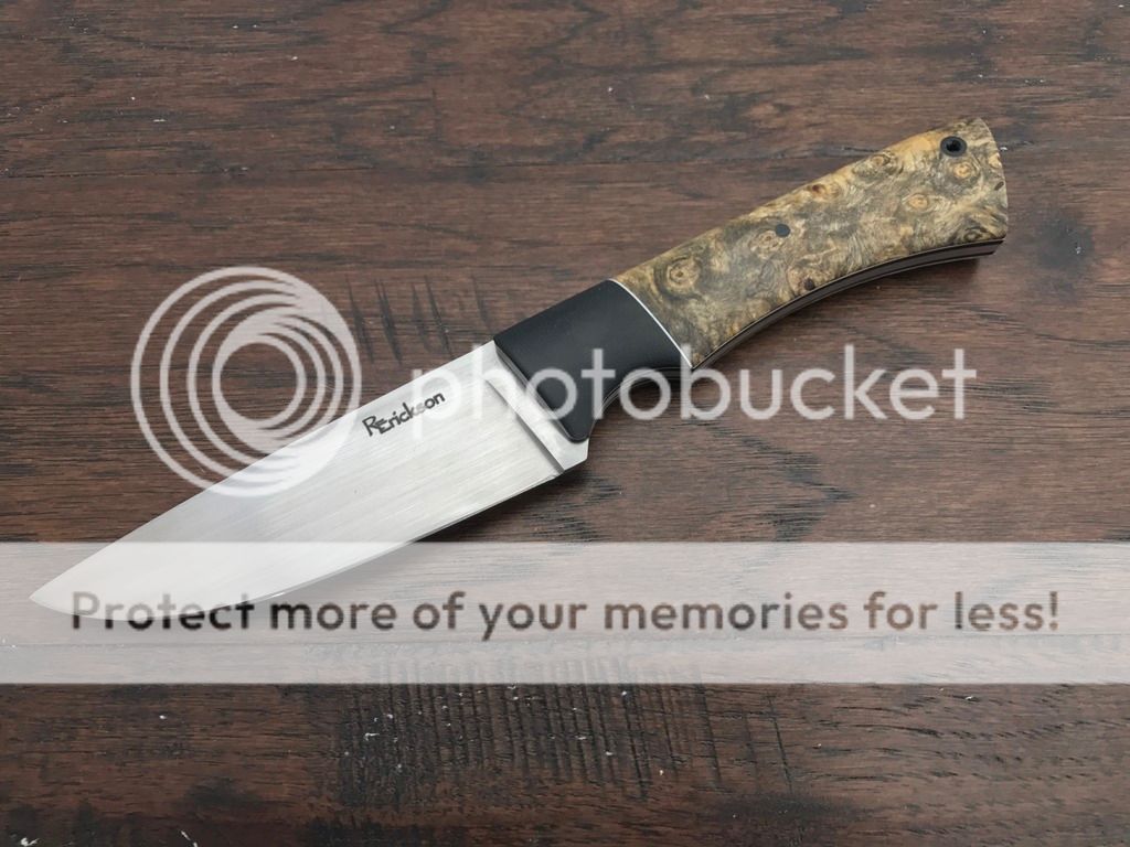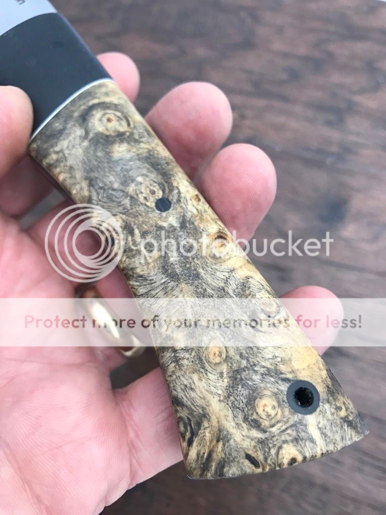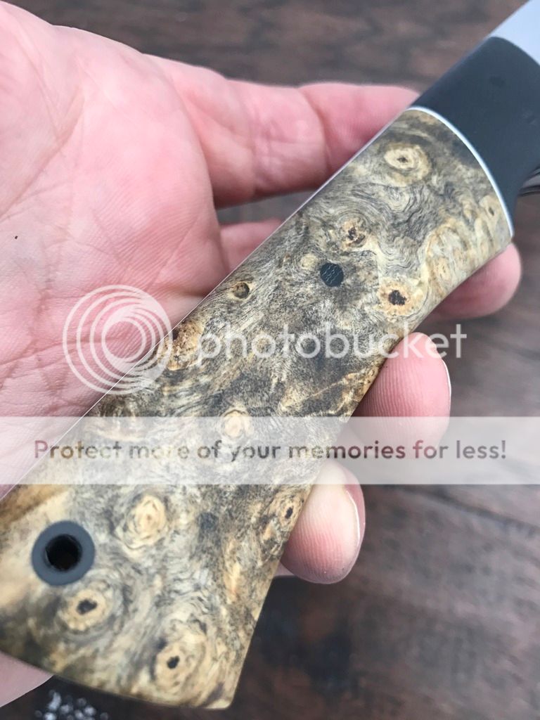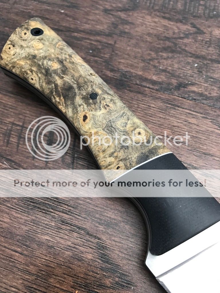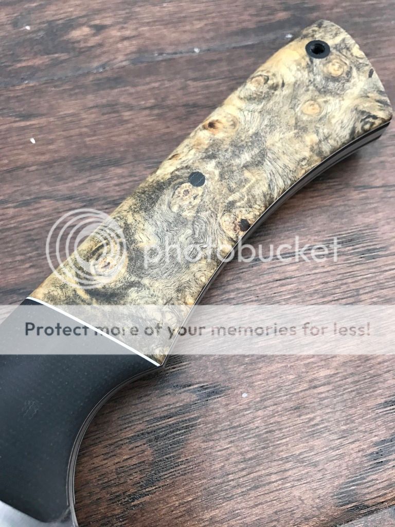 I've got a nice hunter available here for sale. The blade is 20CV which performs close to M390. The handle material is Buckeye Burl stabilized professionally by K&G. Thanks for looking!