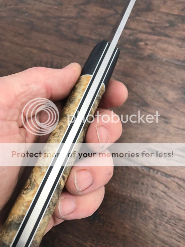 Handle: Stabilized Buckeye Burl with black micarta bolsters. The liners are black micarta and white G10. The pins are micarta and the lanyard tube is carbon fiber.