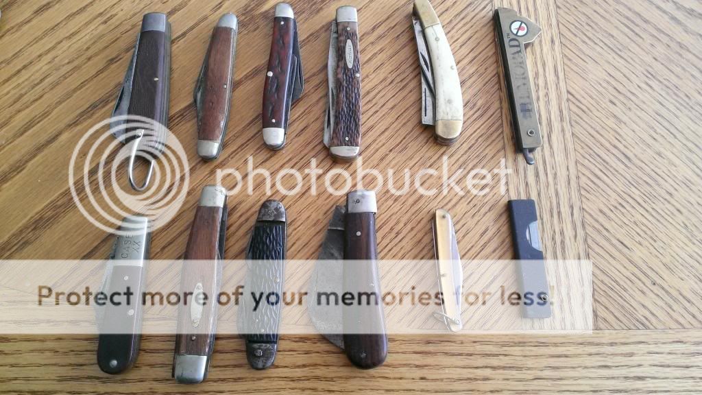Went to a local antique store today just to see if they have any good knives around. Which is when I came across a box with a bunch of sheaths in it, but as I glanced at it through the glass case I noticed some pocket knives in the bottom. I asked the owner of the store to open the case for me to look, but the store was poorly lit and I couldn't see the maker's marks very well. So I took a chance and I have no clue how I did. Some of these are in very rough shape and missing some blades, but I figured that just the pocket knife belt sheaths were worth the price alone.