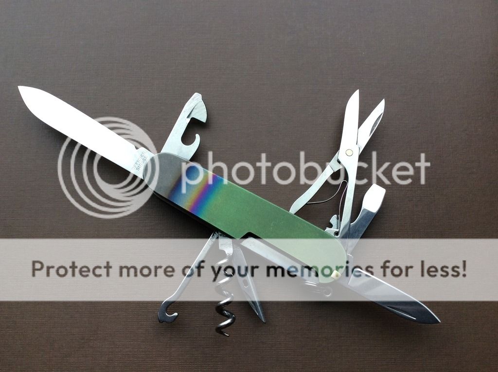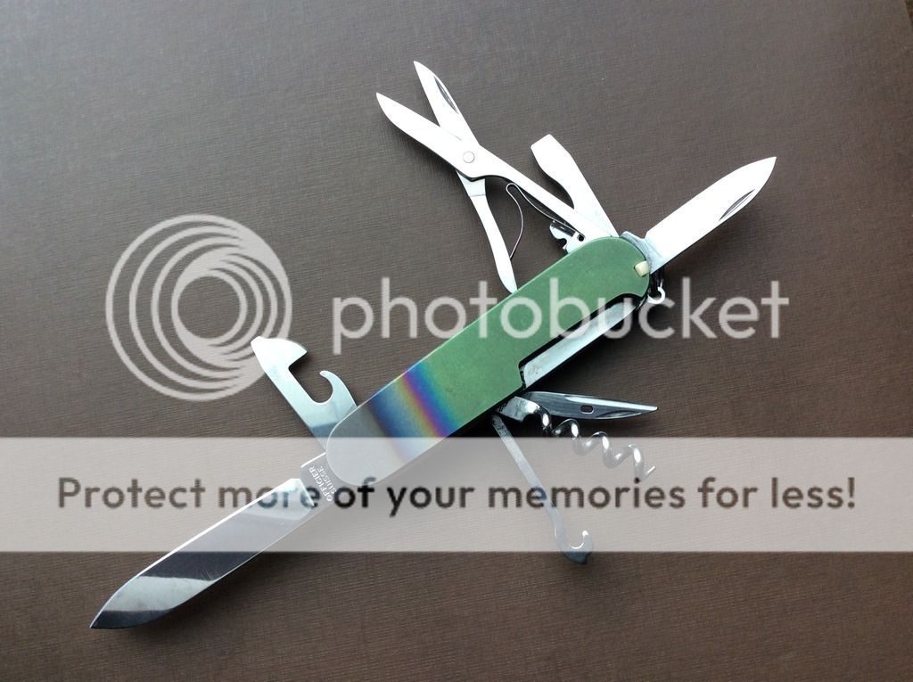 ALM Customized Victorinox Climber- Carried some, no big whoop. Professionally customized by ALM Knives & Tools of Poland. Stonewashed and anodized titanium covers. Grey velvet bag included. Paypal preferred.