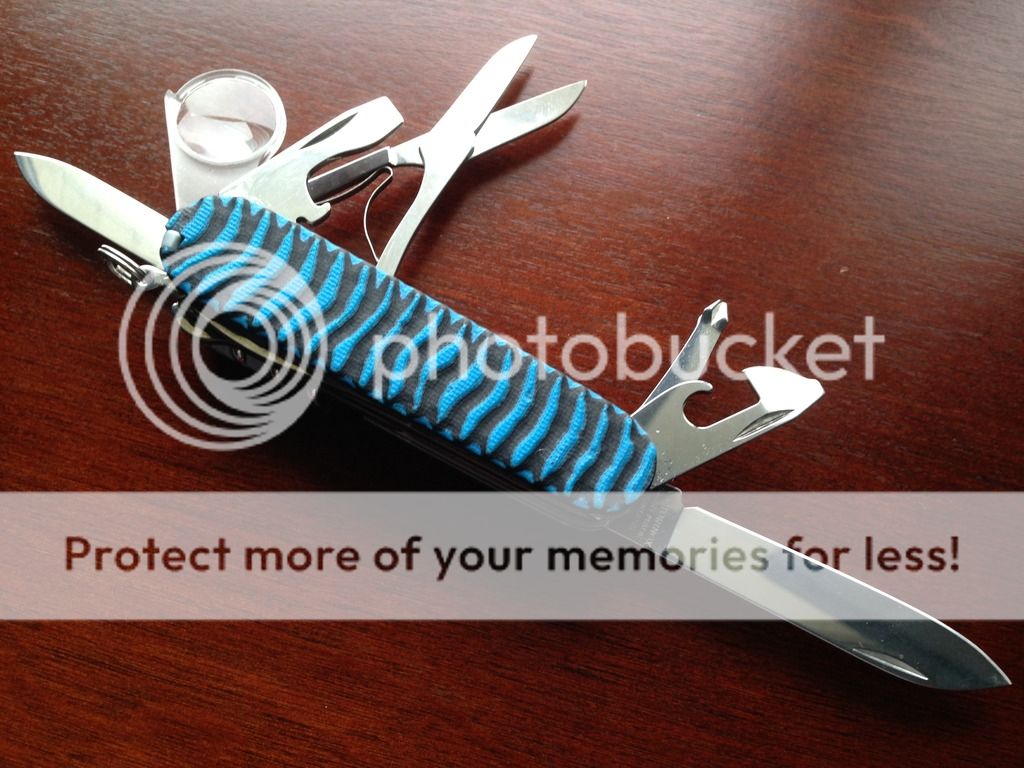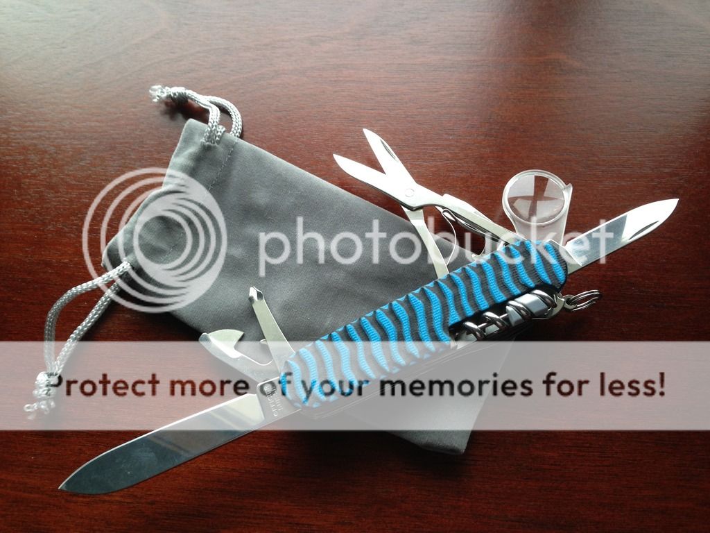 ALM Customized Victorinox Explorer- Carried a few times but in superb condition. Professionally customized by ALM Knives & Tools of Poland. Custom blue & black G10 handles. Very grippy and solid. Grey velvet bag included. Paypal preferred.