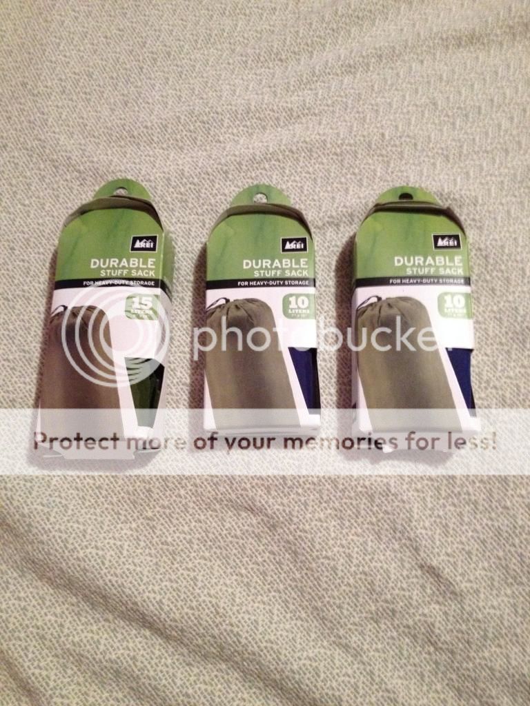 I have 3 brand new REI durable stuff sacks for trade. One green one is 15 liters, and the 2 blue ones are 10 liters.