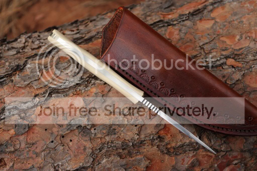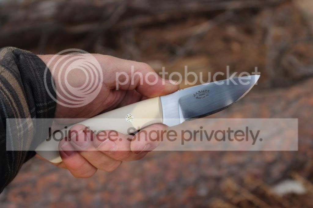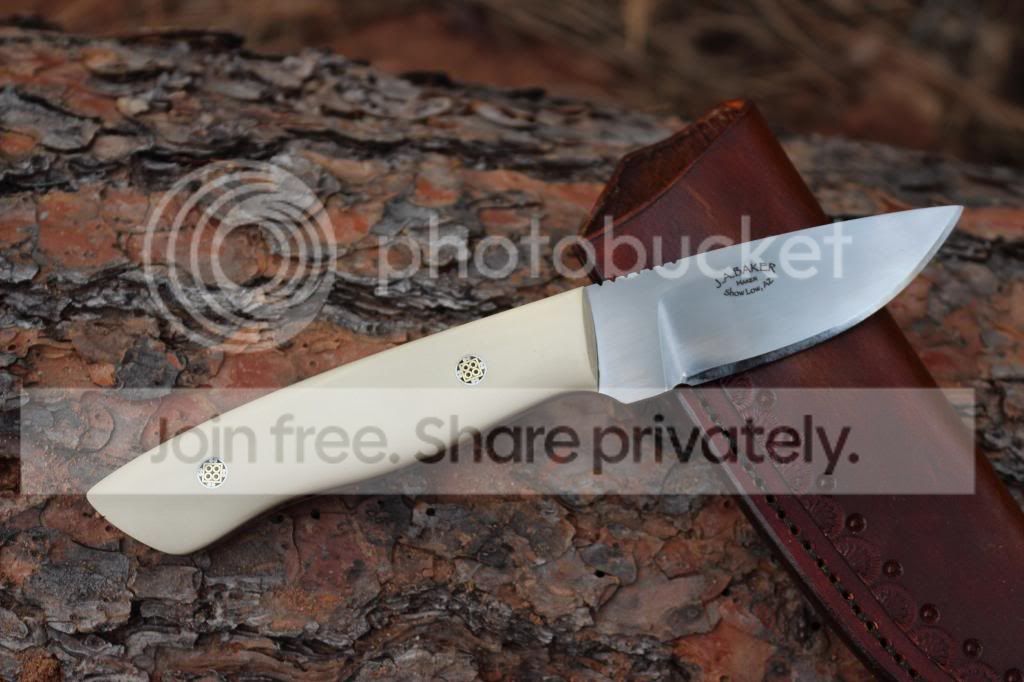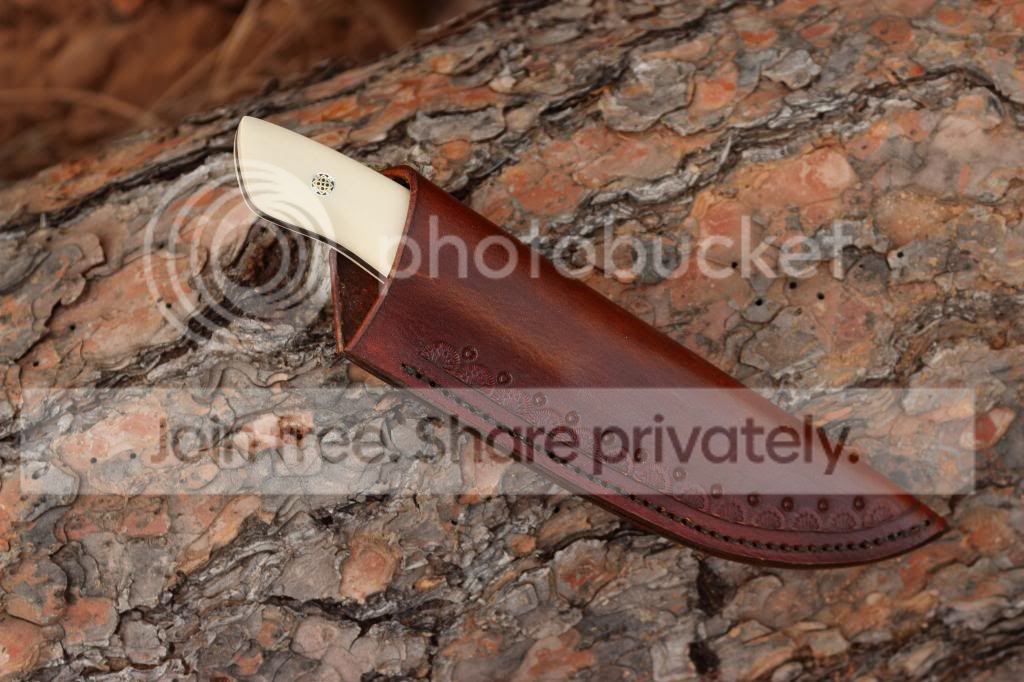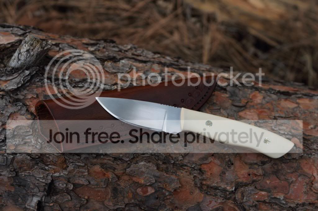 I have a 3" ATS-34 drop point custom with ivory linen micarta scales. Right hand leather sheath included.