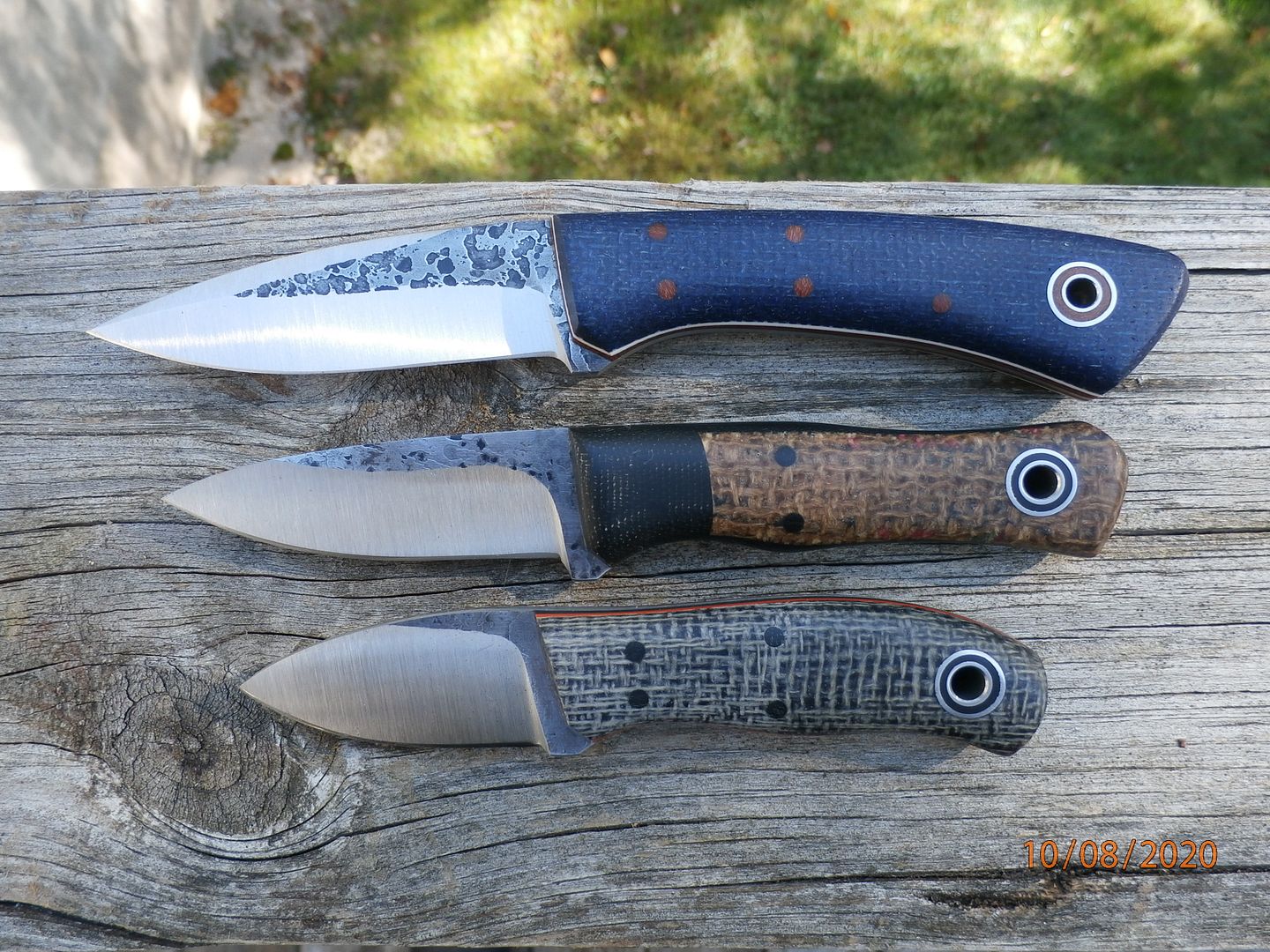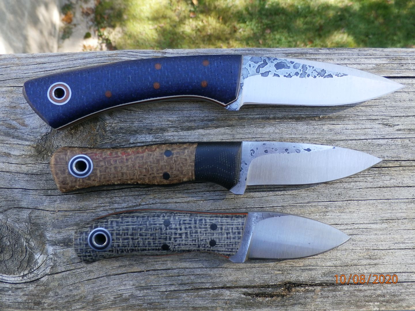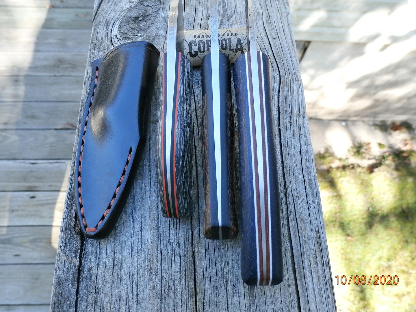 For Sale. Some burlap goodness. All three are new/unused safe queens. Bushboot 1/8" A2 TT with swedge, Blue burlap over natural and white. SOLD. Esquire 1/8" TT 01, Black bolster with black liners and coffee bag burlap. $250.00 PP F&F. Runt 5/32" TT 01 high grind, Black burlap over black and orange. Comes with a matching pocket slip. The blade has a small faint spot of safe rash on the flat you can see in the first pic. GONE.