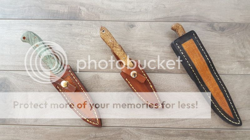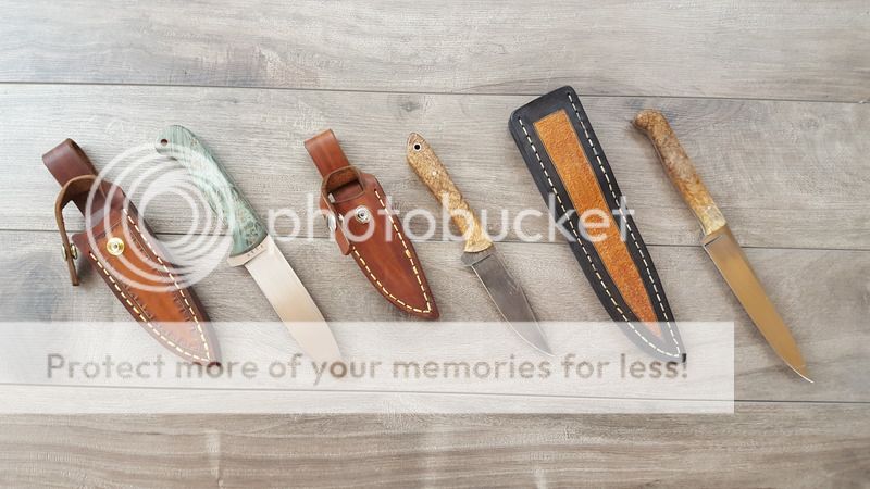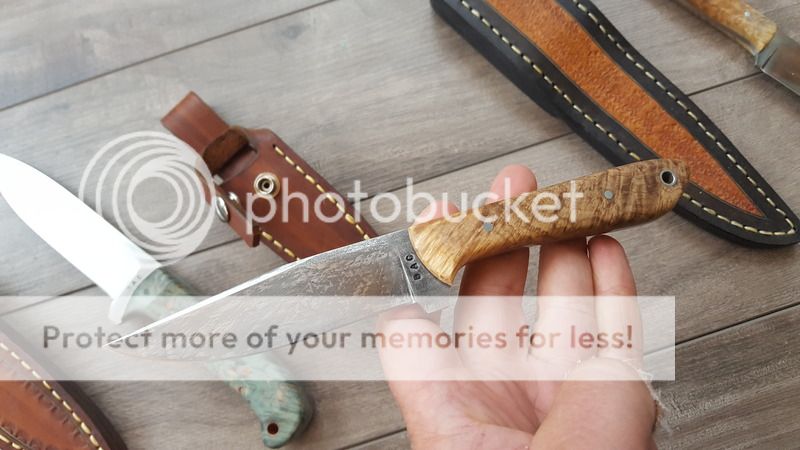The hunter has a WSSI stabilized oak burl handle 4.5" long. The blade is 1/8" 52100 and is 4" tip to scales and has been etched with gun bluing and bleach. Price is $160 shipped CONUS and Canada.