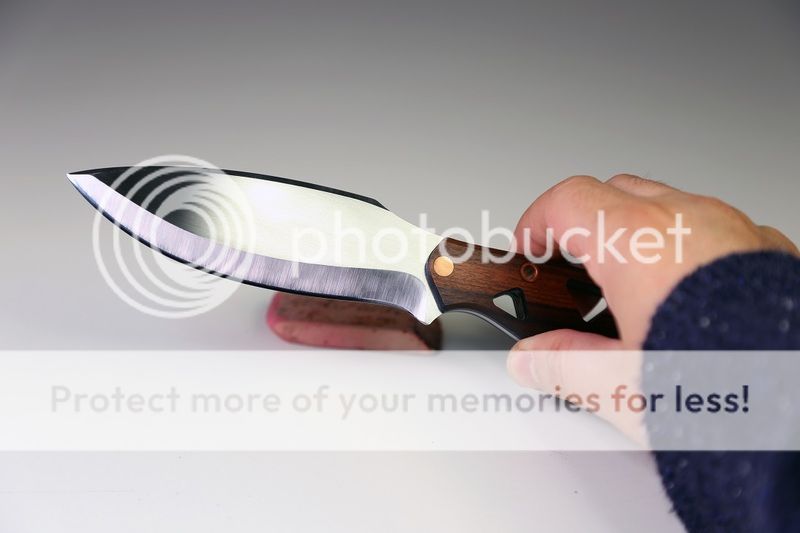 #3 Vako with slimmer blade profile, hollow handle. ( Blade: AEBL 60HRC (.125") flat grind, polished convex edge (very sharp----Handle: Bolivian Rosewood, blue and black G10 liners, copper pins) Blade length: 4.5" Forum price $195 includes sheath and shipping