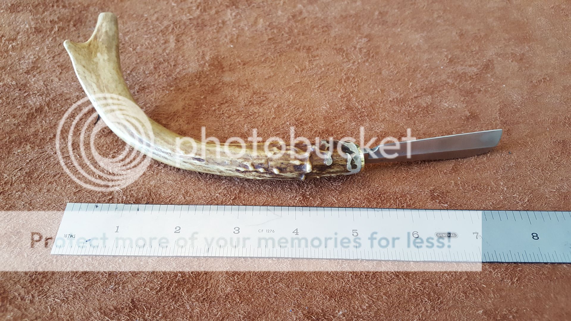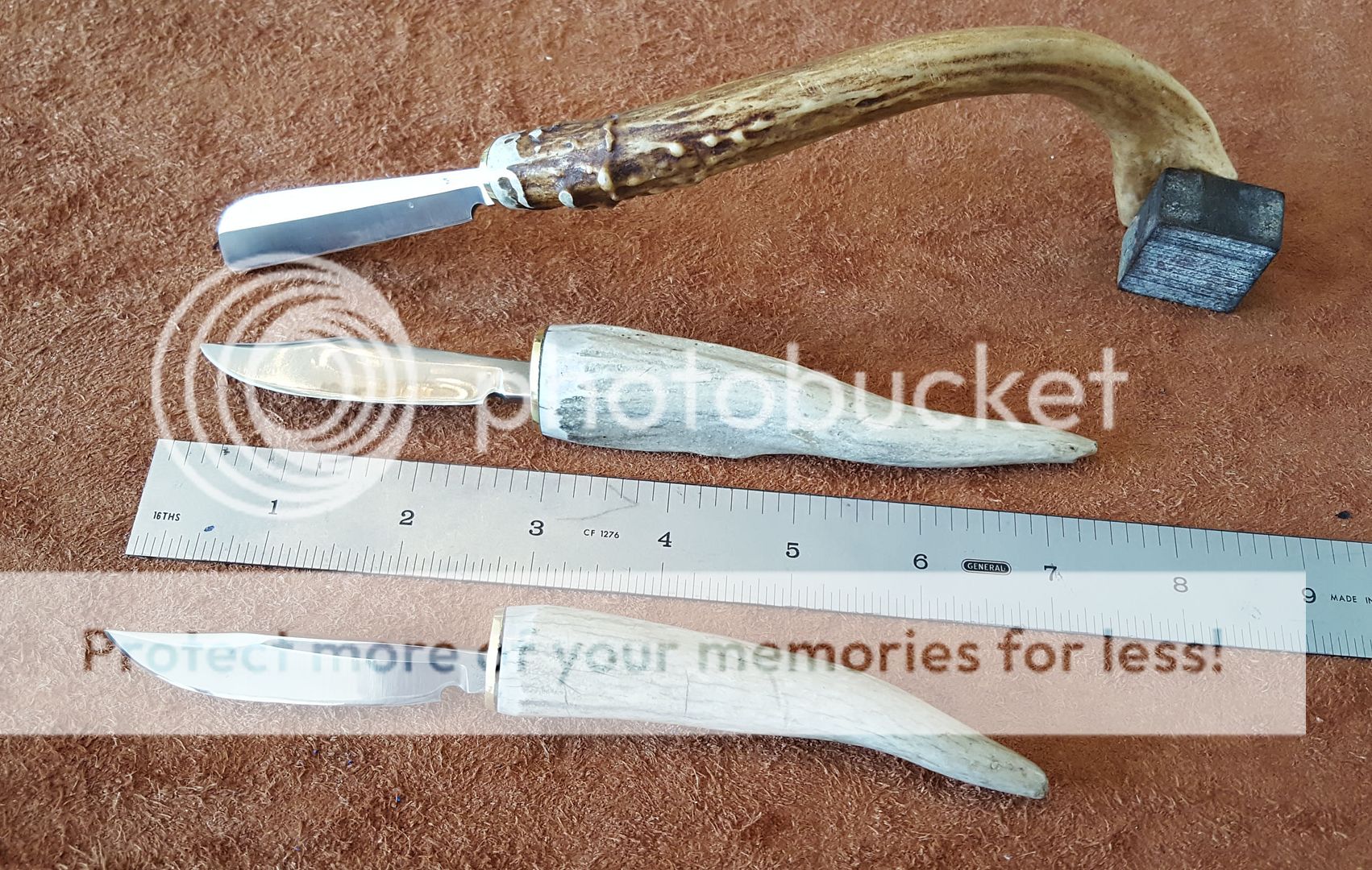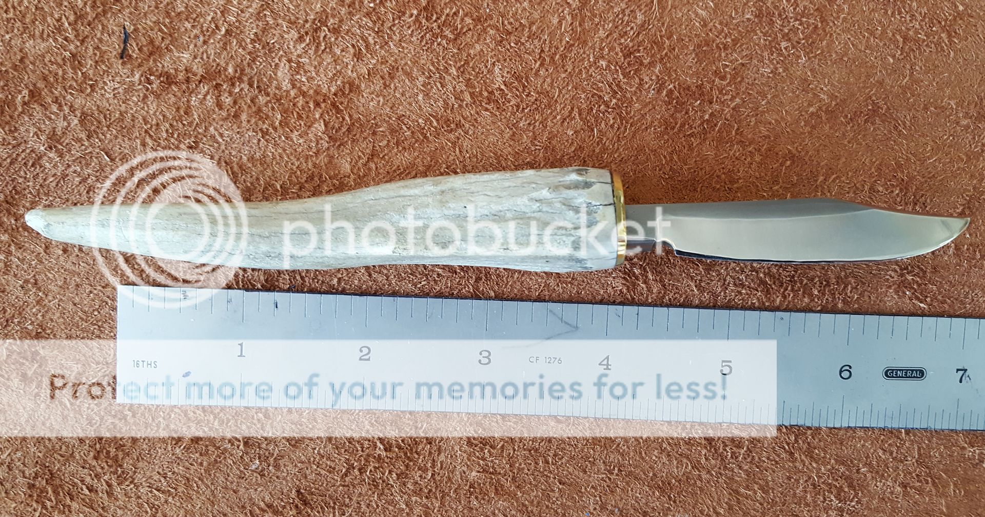 I had some small pieces of CPM-S35-VN around so I thought I would use them to make some small knives. All are hardened to a Rockwell of 61 all are VERY sharp. The tang extends into the antler about 2 inches on each knife. Brass guard between the blade and antler. The bottom of the blade rests against the front of the brass guard only the tang extends through. Blade are all about 3 inches long. Would also make a nice Skinner for bird and trout. The are offered without a sheath so you can be creative. Price $65.00 plus $7.50 for priority shipping to the USA. They are numbered 1 through 3 from the top down on the first picture. If you want I can make you a .080 custom black Kydex neck sheath for additional $10.00. If you want one leave a message on the thread and contact me at kenhills@gmail.com or IM me here for the PayPal info. Thanks for looking. Comments appreciated. Ken