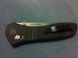 Description: D2 Steel, Plain Edge, Satin Finish. This one has been used lightly and re-sharpened to a hair popping edge. Lock-up is great and it functions flawlessly, its too much blade for me. I don't have the box for this one as I got it in a trade. I do have a nylon Benchmade sheath that I will throw in to make up for it. You don't really need a lot of pictures with this famous model