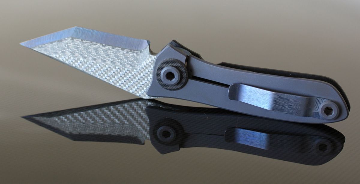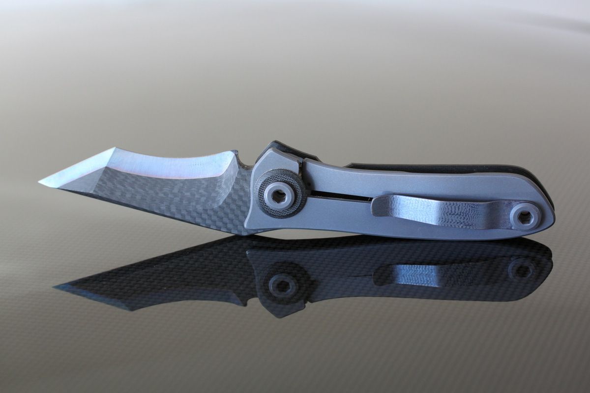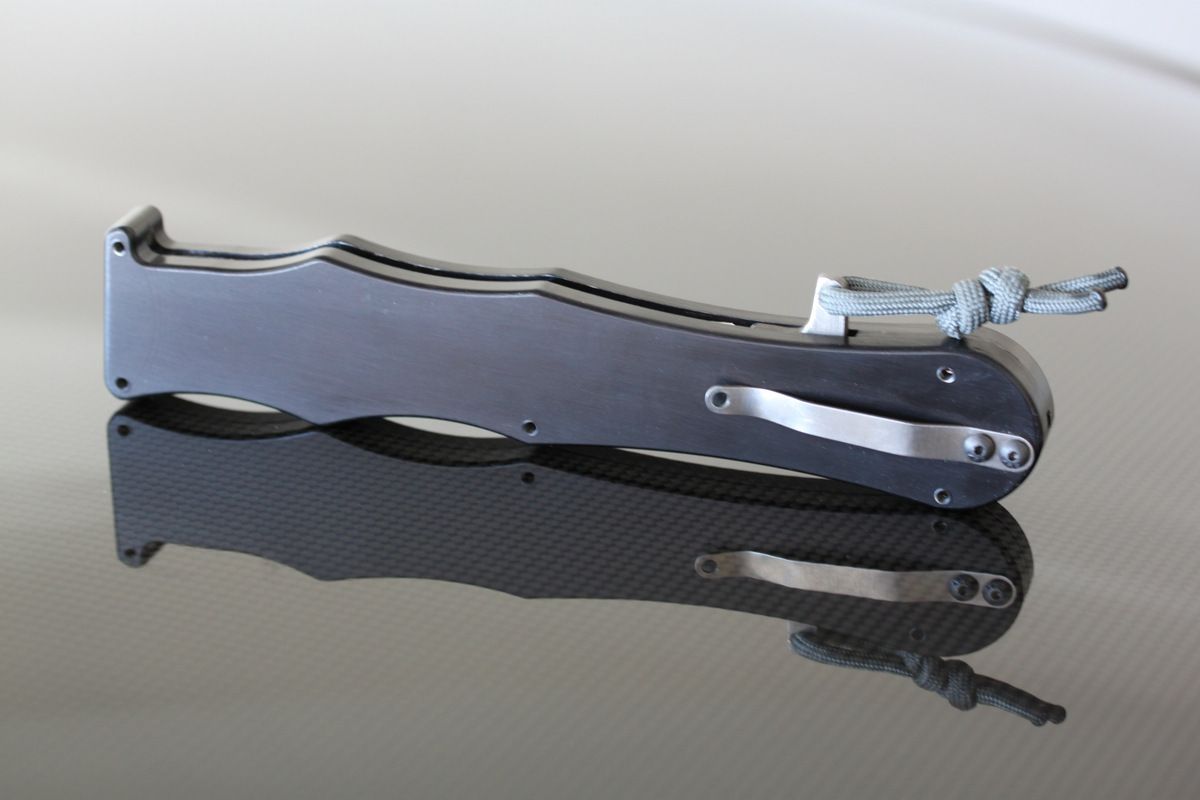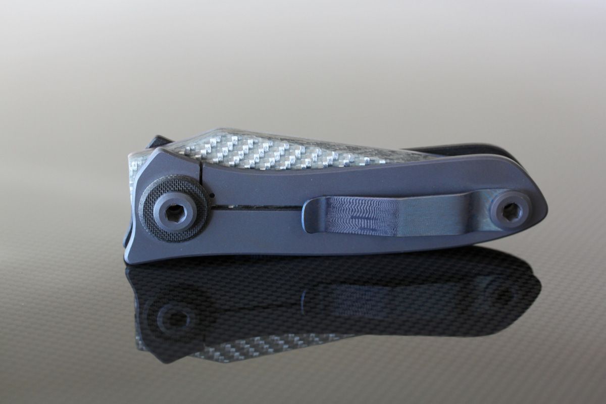Warren Thomas with Aluminum/White Carbon Fiber/Anodized Titanium Blade-G10 and Titanium Scales, one small scratch to the left of clip, otherwise perfect. Never used to cut-$695