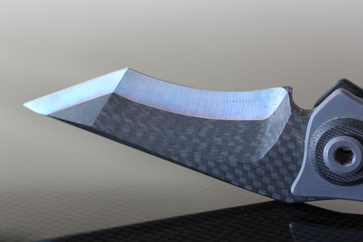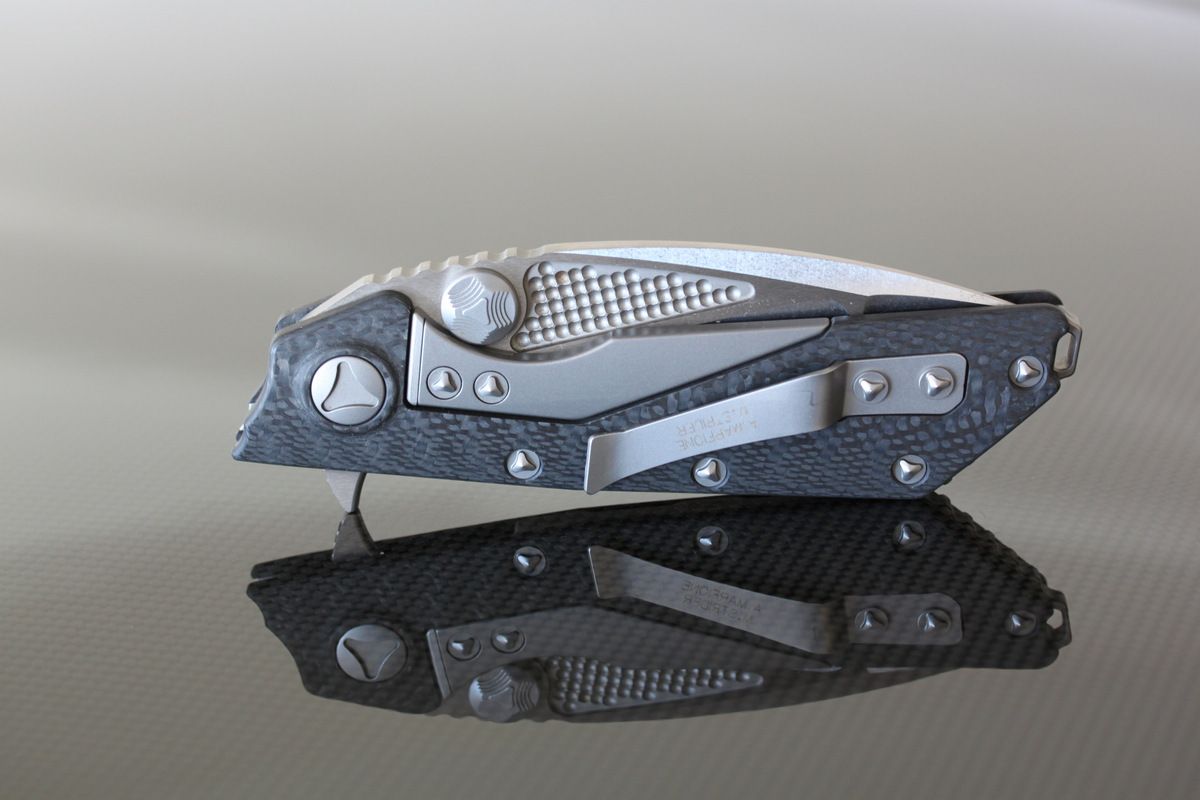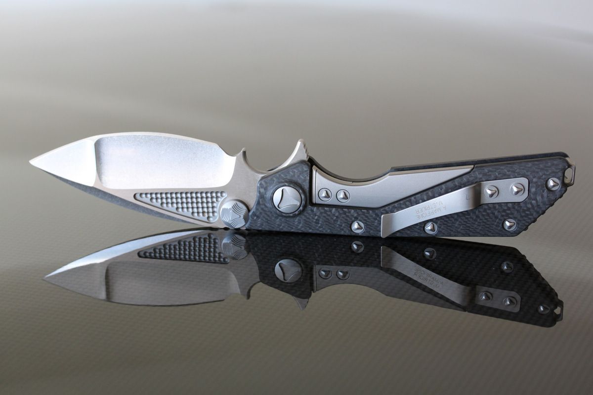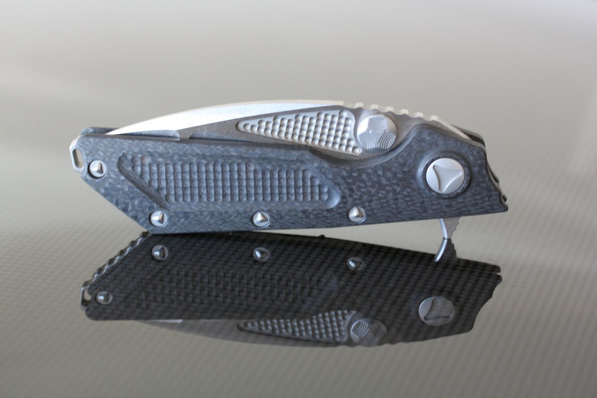 Warren Thomas with Aluminum/White Carbon Fiber/Anodized Titanium Blade-G10 and Titanium Scales, one small scratch to the left of clip, otherwise perfect. Never used to cut-$695