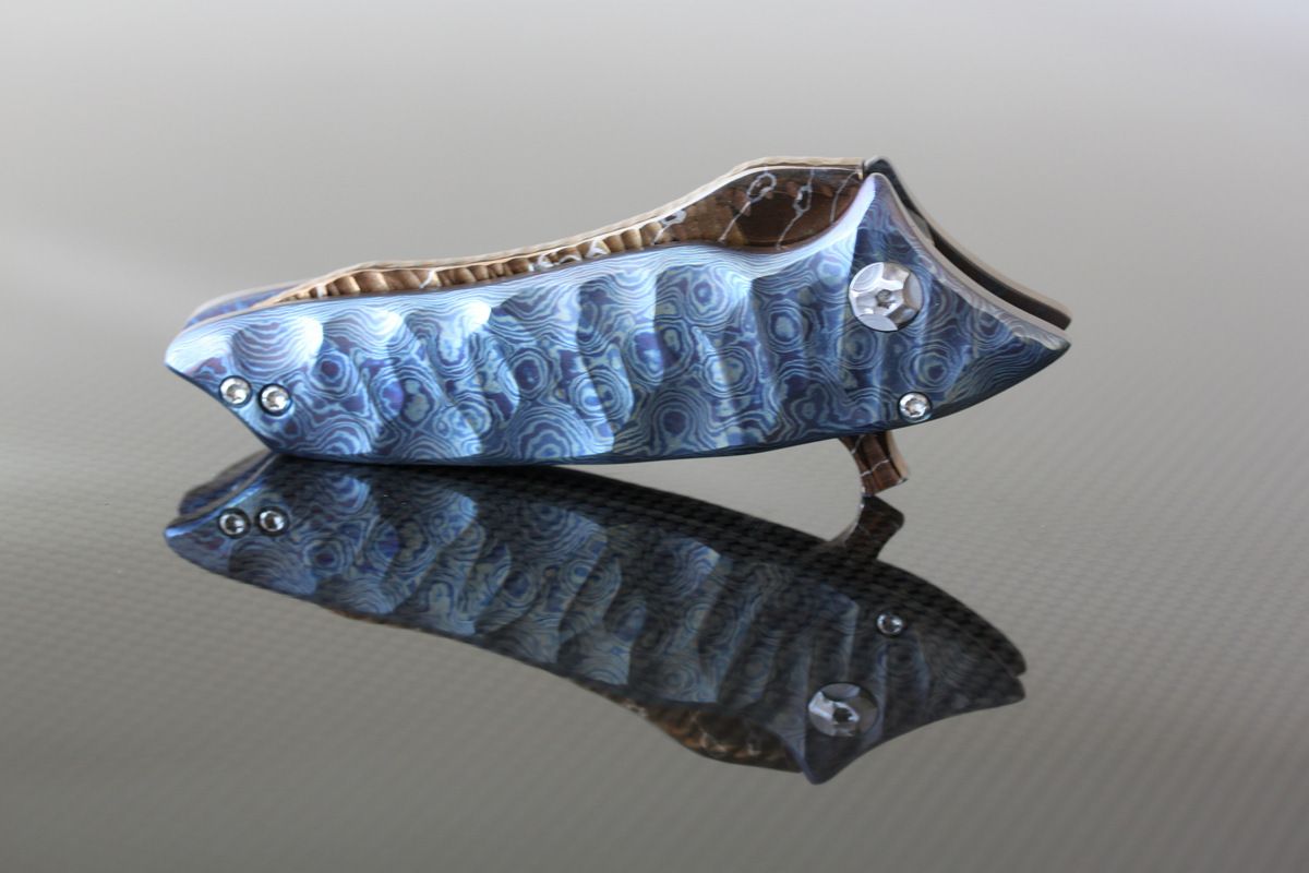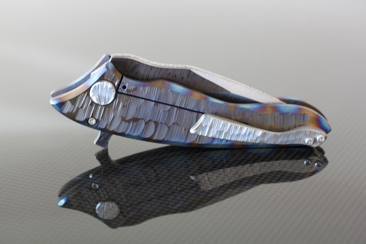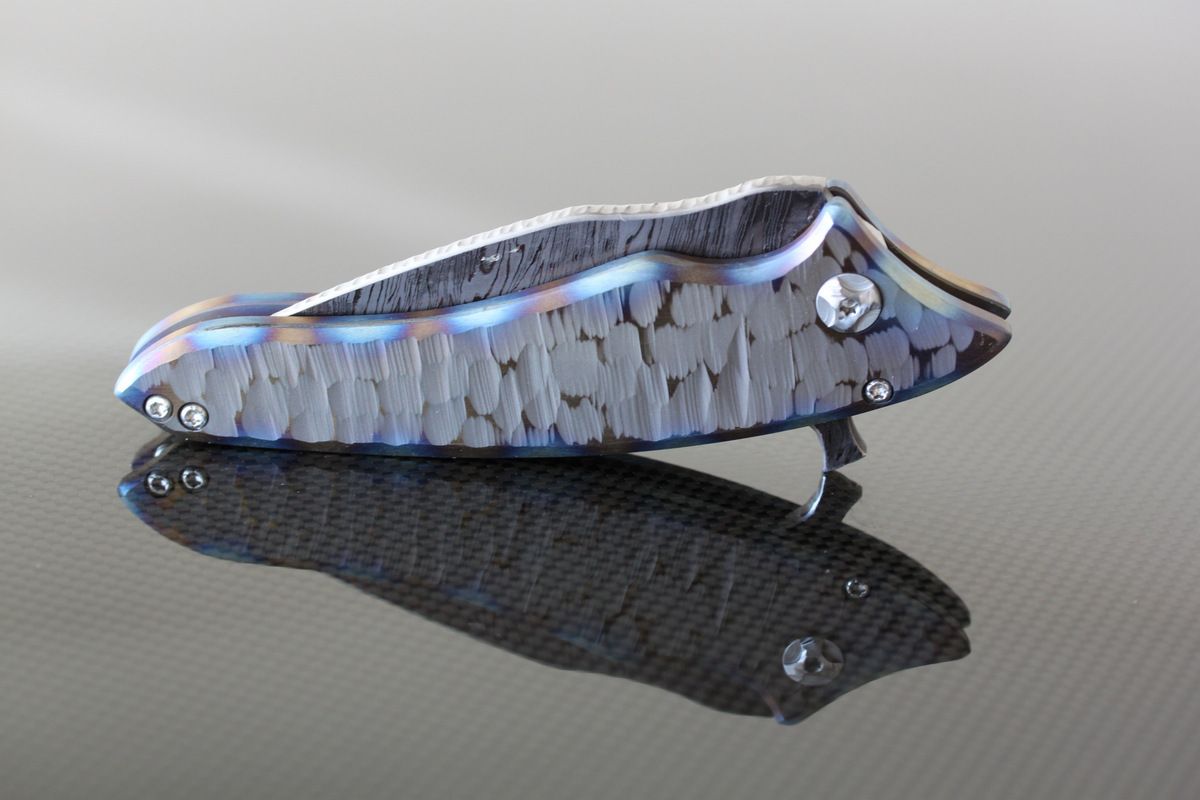 Phantom Steelworks Full size Titanium DUB. Titanium Scales. Chris called this "Unearthed", "Firestorm" Damascus Blade, Chisel ground. Mint, never carried or used- $1200-SOLD