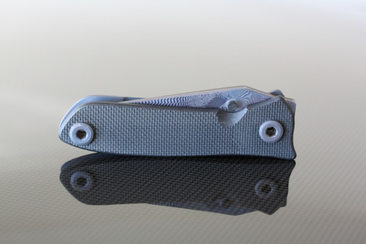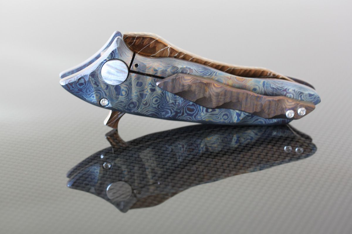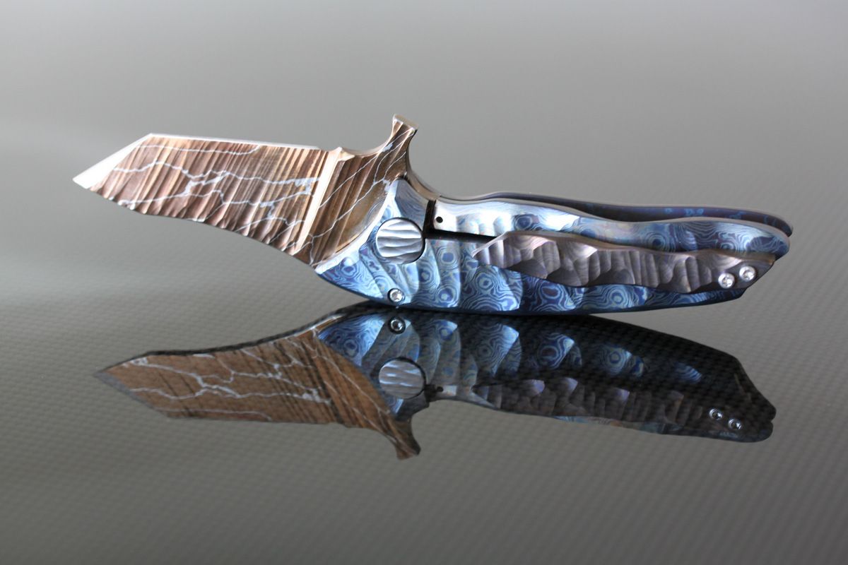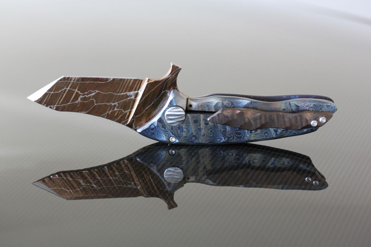 Phantom Steelworks Full size Titanium DUB. Titanium Scales. Chris called this "Unearthed", "Firestorm" Damascus Blade, Chisel ground. Mint, never carried or used- $1200-SOLD