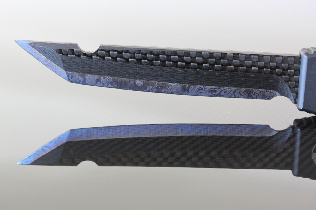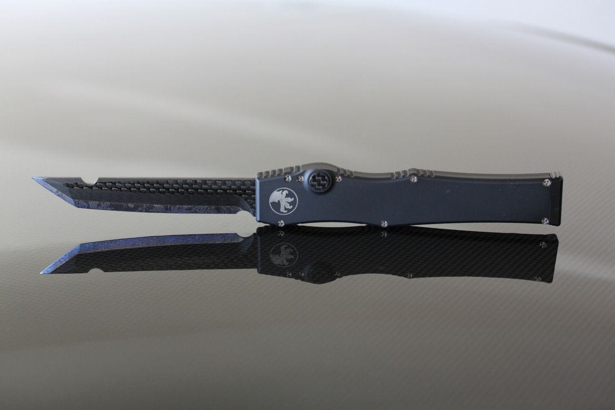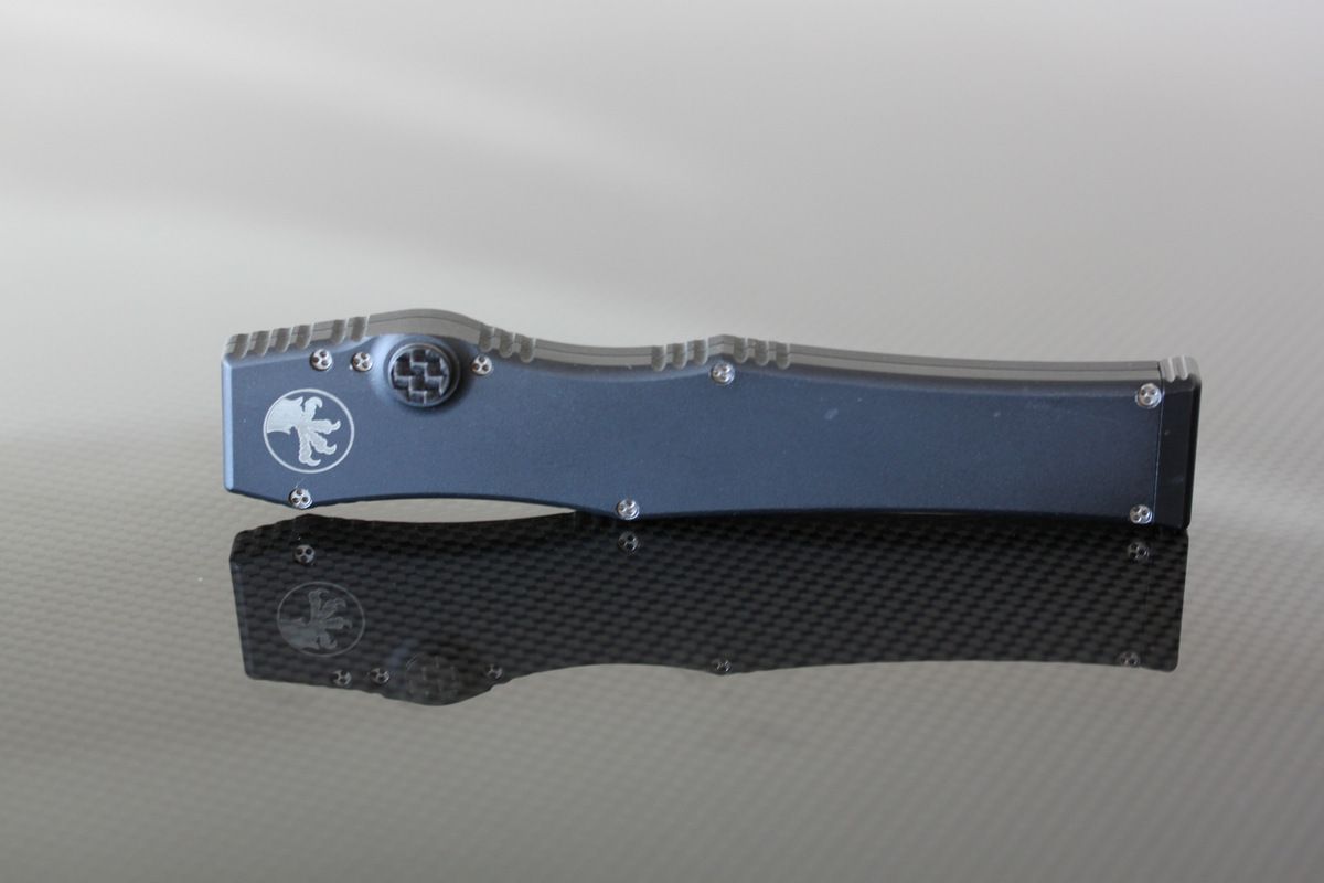 Microtech Halo 3, Customized by Warren Thomas. Carbon Fiber button, Titanium and Carbon Fiber Blade, Titanium Clip. The Clip has some wear on it. Some light marks on the body. A very light knife for the size-$1250