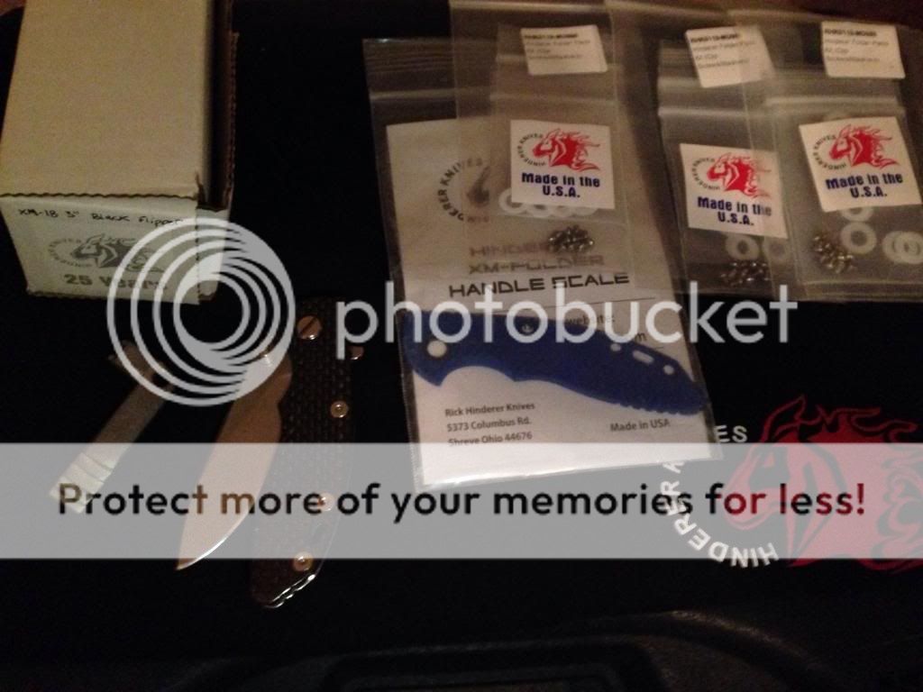 First, is a 3" Hinderer XM 18 with extras. This one has been carried and does have light scratching near the tip of the blade (20CV blade steel). Blade is sterile and stonewashed. Lock side is stonewashed as well. There is a smooth lscf scale installed, which was installed when I picked it up here. I will include a blue G10 scale, three small parts kits, a large black hinderer T-shirt (size is Large), and a spanner tool I made from 1/4" 6AL4V titanium and stonewashed. Ships in the original hinderer box and peanuts. I am asking $550 for everything. I will only have this up until sunday evening with no price reductions as I am hesitant to let this one go.