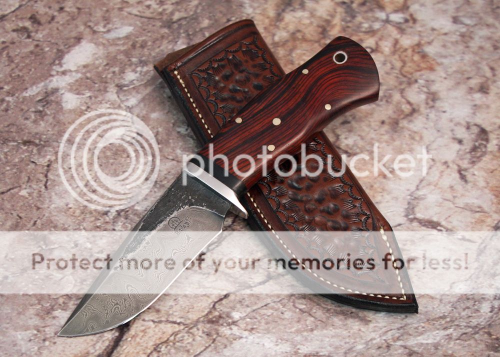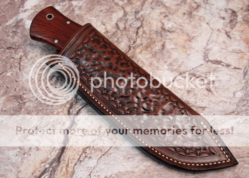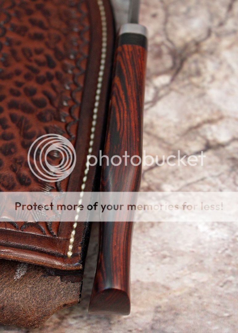 The sheath is 8-9oz hand tooled leather from Wickett and Craig. The knife fits well and draws easily.